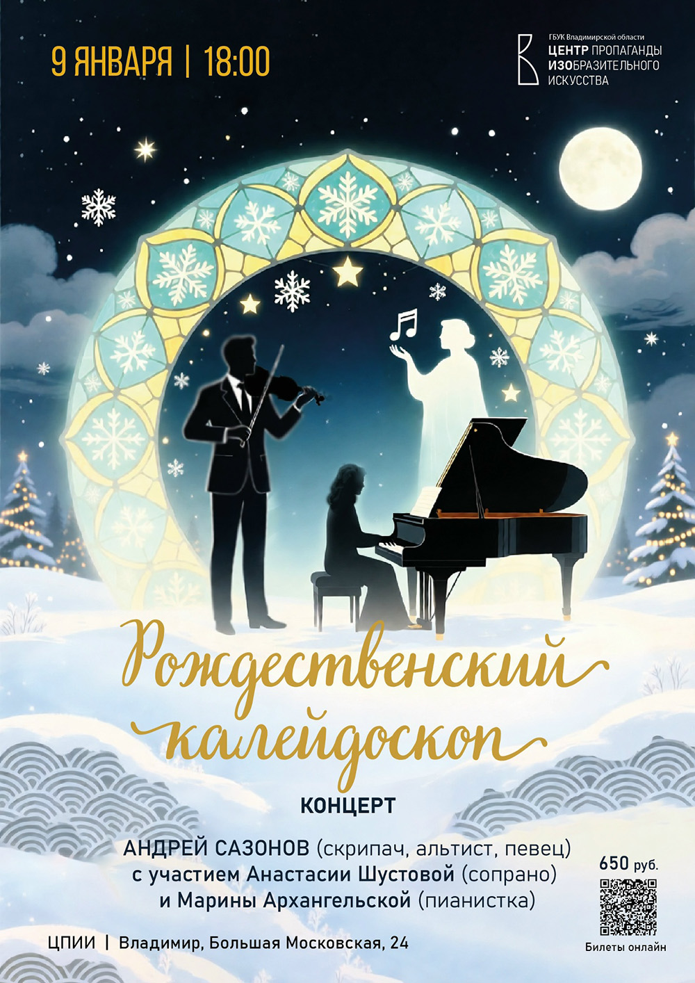 Концерты во Владимире Концерт "Рождественский калейдоскоп"09 января 2026 в 18:00 Центр пропаганды изобразительного искусства приглашает 9 января в 18:00 на концерт среди произведений искусства! А. Сазонов, скрипач, альтист, певец, автор песен, много лет работал в Ансамбле солистов Московской филармонии «Концертино» под управлением заслуженного артиста России А. Корсакова. Он выступал в лучших залах России – Большом зале Московской консерватории, Ленинградской филармонии, гастролировал в городах СССР и за рубежом. Много выступает как солист и ансамблист, записал диск «Мелодия любви» с песнями М. Магомаева. На концерте прозвучит популярная классическая музыка таких известных композиторов как Антонио Вивальди и Винченцо Беллини, а также лучшие советские песни 1960-80 гг.: песни из репертуара Муслима Магомаева и песни Давида Тухманова. Неизменной спутницей Андрея Сазонова на концертах является пианистка Марина Архангельская. Примет участие в программе и Анастасия Шустова (сопрано). Необходима предварительная покупка билетов онлайн или в кассе Центра пропаганды ИЗО. Цена билета: 650 р. Билеты по ссылке: https://vladimirculture.ru/events/81926/koncert-rozhdestvenskii-kaleidoskop Место проведения: Центр пропаганды изобразительного искусства Адрес: г. Владимир, ул. Большая Московская, д. 24 Информация с https://www.izo33.ru/event/135686089 « вернуться владимирская афиша другие концерты во Владимире |