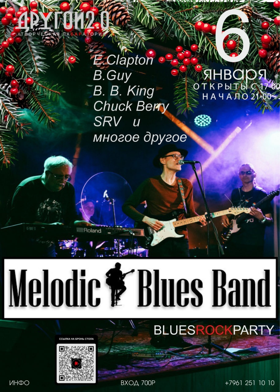 Концерты во Владимире Группа "Melodic Blues Band"06 января 2026 в 21:00 Melodic Blues Band — группа, которая честно и легко играет классику блюза и блюз-рока. В программе — классика, на которой вырос весь мировой блюз-рок: Eric Clapton Buddy Guy B.B. King Chuck Berry …и многое другое Дата: 06 января 2026 Двери: с 17.00 Начало концерта: в 21.00 Место проведения: Другой Бар 2.0 Адрес: Владимир, Студёная гора 36 А INFO / RESERVE / WhatsApp +7 961 251 1010 Информация с https://vk.com/region33rock « вернуться владимирская афиша другие концерты во Владимире |
