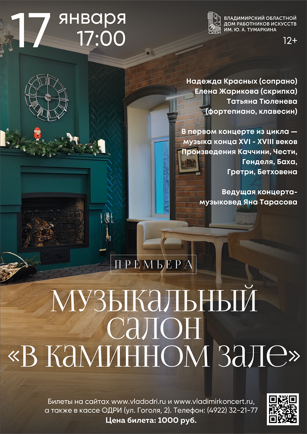 Концерты во Владимире Музыкальный салон «В каминном зале»17 января 2026 в 17:00 Премьера 2026 года — музыкальный салон «В каминном зале» Первый вечер нового проекта Дома работников искусств состоится 17 января. В концертной программе, посвященной музыке 16-18 веков, прозвучит вокальная и инструментальная музыка великих композиторов: Дж. Каччини, А. М. Чести, Г. Ф. Генделя, И. С. Баха, А. Гретри, Л. ван Бетховена, В. А. Моцарта и других композиторов той далекой эпохи. Изящную, завораживающую лирику и сверкающие колоратурные пассажи вы услышите в исполнении лауреатов Всероссийских и Международных конкурсов: Надежды Красных (сопрано), Елены Жариковой (скрипка), Татьяны Тюленевой (фортепиано, клавесин). Ведущая концерта — музыковед Яна Тарасова. Цена билета: 1000 руб. Билеты по ссылке: https://vk.cc/cSSyjZ Дата: 31 января 2025 Начало: в 18.00 Место проведения: Владимирский областной Дом работников искусств Адрес: г. Владимир, ул. Гоголя, 2 Информация с https://vladodri.ru/events/muzykalnyj-salon-v-kaminnom-zale/ « вернуться владимирская афиша другие концерты во Владимире |