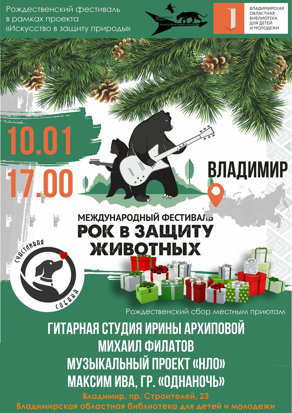 Концерты во Владимире Фестиваль "Владимир. Рок в защиту животных"10 января 2026 в 17:00 "Владимир. Рок в защиту животных" в молодежном корпусе Областной библиотеки для детей и молодежи и традиционный рождественский сбор для местных приютов. В этот раз благополучатели - наши друзья, приют СЧАСТЛИВАЯ СОБАКА. Состав, как всегда, исключителен! Гитарная студия Ирины АрхиповойМихаил Филатов Музыкальный проект "НЛО" Максим Ива а также поздравления известных участников фестиваля Рок в защиту животных, подарки и, конечно, сбор корма. Дата: 10 января 2026 Начало: в 17.00 Место проведения: Областная библиотека для детей и молодежи (молодежный корпус) Адрес: г. Владимир, пр-т Строителей, 23 Вход - упаковка корма Информация с https://vk.ru/rockprotectsanimals33 « вернуться владимирская афиша другие концерты во Владимире |