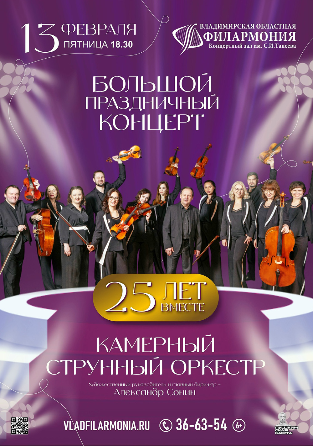 Концерты во Владимире Большой праздничный концерт Камерного струнного оркестра «25 ЛЕТ ВМЕСТЕ» (6+)13 февраля 2026 в 18:30 Камерный струнный оркестр отмечает 25-летие творческого пути ярким вечером, каждая нота которого – поклон истории и уверенный шаг в будущее. Это не просто концерт, а захватывающее музыкальное путешествие, наполненное энергией и юношеским задором, которое не оставит равнодушными ни знатоков классики, ни молодых меломанов. В этот концертный праздник музыканты объединят силы с приглашенными мастерами, чтобы подарить слушателю чистоту звучания и эмоциональное тепло камерной музыки. Программа сочетает полюбившиеся шедевры и редкие жемчужины репертуара, открывая тонкую паузу между лирикой и драмой, светом и тенью. Слушатели всех возрастов найдут здесь точную форму и живую душу: от классической строгости к романтической нежности, от прозрачного баланса струн до яркой сценической выразительности. Финал оставит ощущение праздника и благодарности за долгую историю коллектива. Приходите почувствовать магию струн и вдохновение, которое рождается в единстве талантов и большой любви к музыке! В концерте участвуют солисты филармонии и приглашённые гости. В программе: лучшие номера и фрагменты концертных программ за многолетнюю историю коллектива. Исполнители: КАМЕРНЫЙ СТРУННЫЙ ОРКЕСТРХудожественный руководитель и главный дирижёр – Александр СОНИН Дирижёр – Ирина КОПАЧЁВА-КУРОВСКАЯ (г. Москва) Ведущая – музыковед Яна ТАРАСОВАПродолжительность: 2 часа с антрактом Цена билета: 700-1000 руб. Доступно приобретение билетов по Пушкинской карте Билеты по ссылке: https://iframeab-pre10088.intickets.ru/seance/65751977 Дата: 13 февраля 2026 Начало: в 18.30 Место проведения: Владимирская областная филармония Адрес: г. Владимир, проспект Ленина, дом 1 Информация с https://www.vladfilarmonia.ru/afisha/concerts-in-vladimir/bolshoy-prazdnichnyy-kontsert-kamernogo-strunnogo-orkestra-25-let-vmeste/ « вернуться владимирская афиша другие концерты во Владимире |