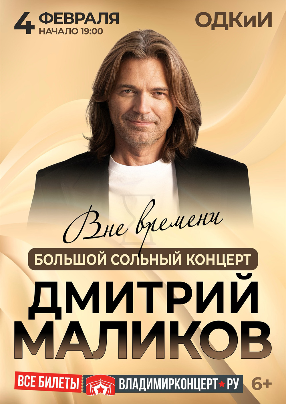 Концерты во Владимире Дмитрий Маликов «Вне времени»04 февраля 2026 в 19:00 Дмитрий Маликов "Вне времени" на профессиональной сцене, он талантливый композитор и пианист, окончивший с красным дипломом Московскую консерваторию; он популярный певец, на песнях которого выросли целые поколения; он блогер с сотнями тысяч подписчиков в социальных сетях, актер, ведущий, амбассадор крупнейших брендов, а главное – он добрый и искренний человек, сохранивший любовь и уважение многих. Быть долго в профессии – это уже достижение, тем более быть всегда среди лучших. 4 февраля Дмитрий даст большой сольный концерт во Владимире на сцене Областного Дворца культуры и искусства. Лучшие песни и инструментальные композиции, все грани таланта и обаяния великолепного артиста, красивое шоу, неповторимая весенняя атмосфера в зале и все это только для Вас! ЗВЕЗДА МОЯ ДАЛЕКАЯ станет ближе, чем кажется. В этом вы еще раз сможете убедиться! Вы знаете эти песни, вы выросли на этих песнях, вы любите эти песни, вы подпеваете вместе с нами. Будет интересно всем, вне зависимости от возраста и музыкальных пристрастий. Цена билета: 3600-7500 руб. Билеты по ссылке: https://vladimirkoncert.ru/shows/event/10157-Dmitrii-Malikov-Vne-vremeni Дата: 04 февраля 2026 Начало: в 19.00 Место проведения: Областной Дворец культуры и искусства Адрес: г. Владимир, ул. Диктора Левитана, д. 4 Информация с http://odk33.ru/afisha/dmitrij-malikov-vne-vremeni « вернуться владимирская афиша другие концерты во Владимире |