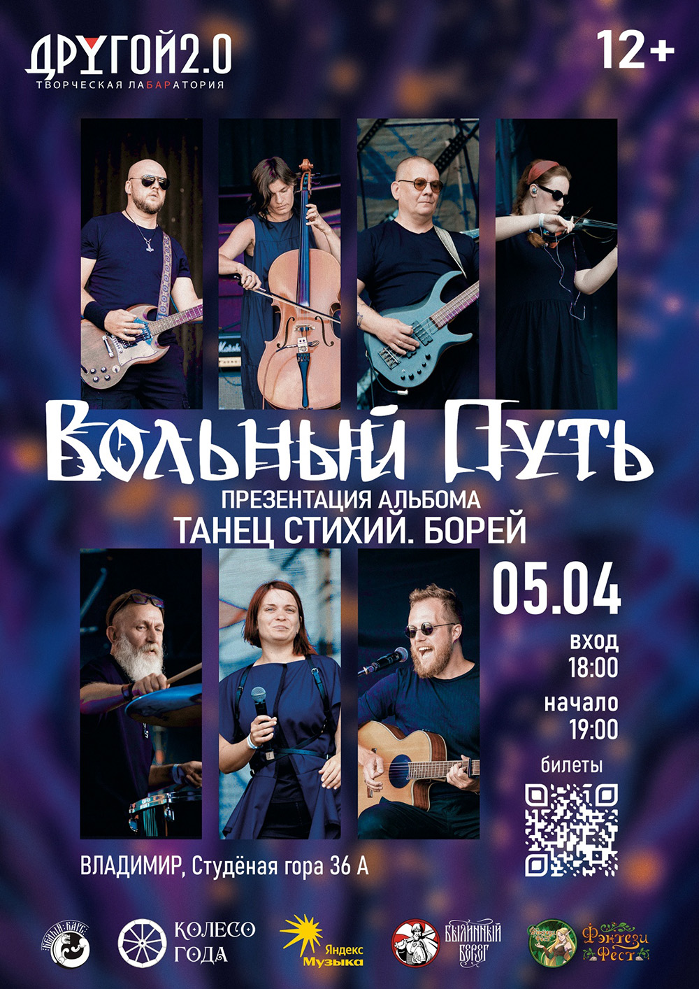 Концерты во Владимире Группа "Вольный Путь"05 апреля 2026 в 19:00 5 апреля во Владимире на сцене ДРУГОЙ БАР 2.0 состоится сольный концерт фолк-рок группы "Вольный Путь", посвященный выходу нового альбома "Танец стихий. Борей". Музыканты привезут обширную программу из песенных историй: горячо полюбившихся слушателям хитов и самых свежих новинок. Концерт обещает быть жарким, пламенным, атмосферным, пронизанным дружеским теплом и богатым на яркие впечатления до такой степени, что точно растопит снега и прогонит морозы. Если уж и встречать весну, то только так. Билеты по ссылке: https://vk.cc/cSfpCC Дети до 12 лет (включительно), могут посетить концерт бесплатно. Места за столом - только по билетам. Несовершеннолетние до 16 лет могут посетить мероприятие только в сопровождении законного представителя. Несовершеннолетние от 16 до 18 лет могут посетить мероприятие в сопровождении взрослого. Дата: 05 апреля 2026 Вход: с 18.00 Начало: в 19.00 Место проведения: Другой Бар 2.0 Адрес: Владимир, ул. Студёная гора, 36А Информация с https://vk.ru/vpvla050426 « вернуться владимирская афиша другие концерты во Владимире |