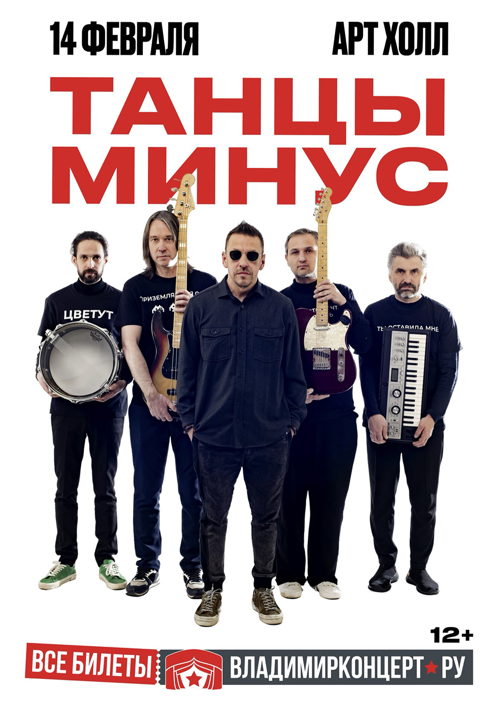 Концерты во Владимире Группа «Танцы минус»14 февраля 2026 в 18:00 Культовая группа, одна из самых ярких и нестандартных в русском музыкальном пространстве, снова радует поклонников. Не пропустите! «Танцы минус» и Слава Петкун уже собрали лучшие хиты в самую горячую программу года и готовы представить её на большом концерте во Владимире! Танцы Минус - легендарный коллектив из Санкт Петербурга под художественным руководством Вячеслава Петкуна. За 20 лет существования группа создала несколько десятков радийных хитов, выпустила 11 альбомов. Песни группы звучат в саунтреках к культовым фильмам, включая манифест поколения - фильм “Брат 2” Алексея Балабанова. Российский тур группы будет состоять из больших сольных концертов в программе каждого - все хиты и новые песни. Группу «Танцы Минус» вполне можно назвать легендой отечественной рок-сцены. Шутка ли сказать, музыкальный коллектив был образован более двадцати лет назад. Несмотря на возраст, песни Вячеслава Петкуна, бессменного руководителя команды, любят до сих пор. Во время выступлений поклонники с радостью поют вместе с группой такие хиты, как «Город», «Цветут цветы», «Половинка», «Из Ленинграда», «Ты далеко» и др. Изначально музыкальный коллектив Вячеслава Петкуна назывался просто «Танцы». Чуть позже к этому слову было решено добавить «Минус». Настоящим звездным часом для группы стал момент, когда вышла песня «Город». Создавалось такое впечатление, что в то время она звучала из каждого утюга. «Танцы Минус» сразу же стали приглашать на многочисленнее фестивали и концерты. Билет на концерт Танцы Минус станет настоящим подарком верным поклонникам группы, специально для которых артисты приготовили множество интереснейших сюрпризов. Цена билета: 2800-6100 руб. Билеты по ссылке: https://www.vladimirkoncert.ru/shows/event/9995-Tantsy-Minus Дата: 14 февраля 2026 Начало: в 18.00 Место: Арт Холл Адрес: г. Владимир, ул. Северная, 2А Информация с https://arthall.org/events/kontserty/tantsy-minus « вернуться владимирская афиша другие концерты во Владимире |