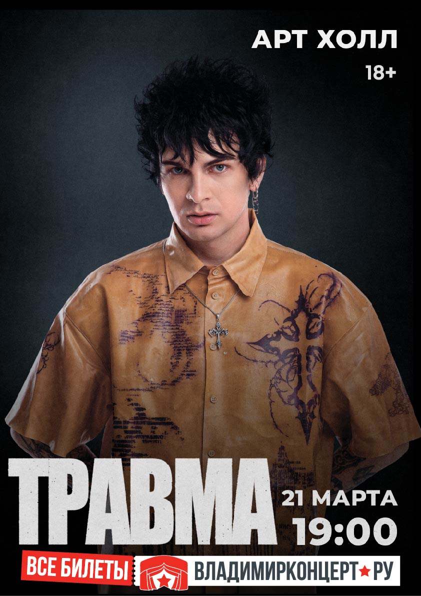 Концерты во Владимире ТРАВМА21 марта 2026 в 19:00 Уважаемые зрители! На все билеты, кроме фан-зоны, действует акция 2+1: при покупке двух билетов, третий идет в подарок! Успейте приобрести билеты. Ранний запуск для билетов категория «Фан-Зона» в 18:00 Приходи, чтобы проникнуться атмосферой артиста под звуки фонка. Концерт станет настоящим событием для всех, кто ищет новые эмоции и впечатления. Цена билета: 1600-5100 руб. Билеты по ссылке: https://www.vladimirkoncert.ru/shows/event/9137-TRAVMA Дата: 21 марта 2026 Начало: в 19.00 Место: Арт Холл Адрес: г. Владимир, ул. Северная, 2А Информация с https://arthall.org/events/kontserty/travma-2 « вернуться владимирская афиша другие концерты во Владимире |