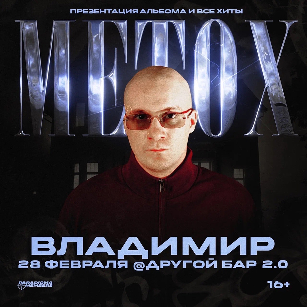 Концерты во Владимире METOX28 февраля 2026 в 18:00 Большой сольный концерт METOX в Владимире: презентация нового альбома + все хиты артиста! METOX — уникальный хип-хоп исполнитель, известный своим мрачным стилем и совместными работами с Пашей Техником, Каспийский Груз, Loc-Dog и многими другими! 28 Февраля в Владимире вас ждёт насыщенная программа, живое общение, мощная энергетика! Все хиты и презентация нового альбома METOX! Билеты: https://vk.cc/cS5tpt Дата: 28 февраля 2026 Начало: в 18.00 Место проведения: Другой Бар 2.0 Адрес: Владимир, ул. Студёная гора, 36А Информация с https://vk.com/metox_vladimir « вернуться владимирская афиша другие концерты во Владимире |
