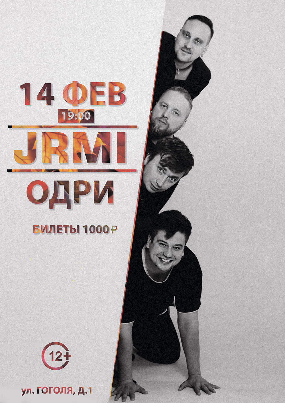 Концерты во Владимире Концерт группы "JRMI"14 февраля 2026 в 19:00 Группа JRMI выступит с двухчасовой акустической программой во Владимире. Ребята подготовили свои лучшие лирические песни. На этот раз с JRMI играет известный Владимирский музыкант Олег Христоев. Благодаря его участию зрителей ожидает новое звучание знакомых песен JRMI и оригинальный аккомпанемент. Концерт 14 февраля — главное мероприятие года для поклонников группы, а также для тех, кто хочет романтического погружения в этот праздничный день. Цена билета: 1000 руб. Билеты по ссылке: https://vladimirkoncert.ru/shows/event/10531-Kontsert-gruppy-JRMI Дата: 14 февраля 2026 Начало: в 19.00 Место проведения: Владимирский областной Дом работников искусств Адрес: г. Владимир, ул. Гоголя, 2 Информация с https://vladodri.ru/events/koncert-gruppy-jrmi/ « вернуться владимирская афиша другие концерты во Владимире |