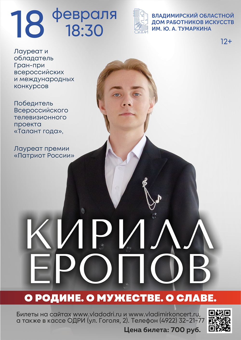 Концерты во Владимире Сольный концерт Кирилла Еропова «О Родине. О мужестве. О славе»18 февраля 2026 в 18:30 В преддверии Дня защитника Отечества, 18 февраля, во Владимирском областном Доме работников искусств состоится сольный концерт молодого талантливого исполнителя Кирилла Еропова. В концертной программе «О Родине. О мужестве. О славе.» Кирилл представит зрителям песни, посвящённые мужеству и славе наших защитников, песни, которые трогают до глубины души. Кирилл Еропов – многократный лауреат и обладатель Гран-При всероссийских и международных конкурсов, Лауреат премии «Патриот России», Кавалер Ордена «Служение искусству», участник концертов в Государственном Кремлёвском Дворце и на других знаковых площадках, участник различных благотворительных мероприятий, концертов для бойцов СВО, военнослужащих и членов их семей, в том числе в госпиталях и военных частях. Творчество Кирилла пронизано патриотизмом и любовью к Родине, что делает его выступления особенно значимыми в дни, когда мы чествуем защитников Отечества. Этот вечер — о преемственности поколений, о благодарности и о том, что делает нас единым народом. Мы отдадим дань уважения «героям былых времён» и тем, кто продолжает их дело сегодня. Цена билета: 700 руб. Билеты по ссылке: https://vk.cc/cTItH7 Дата: 18 февраля 2026 Начало: в 18.30 Место проведения: Владимирский областной Дом работников искусств Адрес: г. Владимир, ул. Гоголя, 2 Информация с https://vladodri.ru/events/solnyj-koncert-kirilla-eropova-o-rodine-o-muzhestve-o-slave/ « вернуться владимирская афиша другие концерты во Владимире |