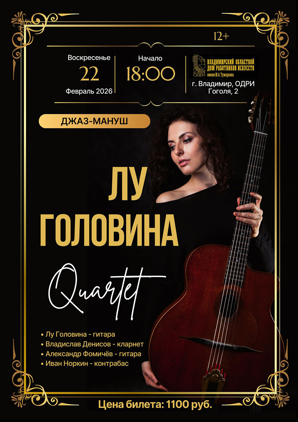 Концерты во Владимире Концерт Lu Golovina Quartet22 февраля 2026 в 18:00 Цыганский по духу и происхождению, мануш — одно из самых свободных направлений в джазе. Пожалуй, единственный постоянный элемент в джипси-джазе — специальная акустическая мануш-гитара, которая является неотъемлемым атрибутом стиля. Lu Golovina Quartet стремится показать зрителю всё богатство и многообразие стиля. Французские вальсы-мюзет, американский свинг, латиноамериканские румба и босса-нова, современная рок-музыка, и даже русские народные, а также цыганские песни нашли свое отражение в джипси-джазе. Из всего разнообразия стиля зритель может выбрать, какой джаз-мануш нравится именно ему. Лидер квартета, московская джазовая гитаристка Лу Головина, ведет активную концертную деятельность в составе известного джаз-мануш-коллектива Django Friends, а также руководит собственными ансамблями Touche de Manouche и Lu Golovina Quartet. Регулярно выступает в ведущих московских джазовых клубах. Энтузиастка стиля джаз-мануш, полагает, что эта музыка способна передать слушателю абсолютно все эмоции и чувства, не выходя за пределы своей стилистики. Вместе с лидером и фронт-леди квартета в концерте примет участие Владислав Денисов — кларнетист-виртуоз, широко известный в джаз-мануш кругах. Владислав является артистом Московской Государственной Академической Филармонии им. П.И. Чайковского, выступает и сотрудничает с известными артистами: Toto Cutugno (Италия), UB40 (Великобритания), Даниил Крамер, Сергей Жилин (Россия). Постоянный участник фестиваля Славянский Базар, участник ансамбля Дмитрия Купцова. Выступает в этнических проектах «Дуброва», «Grand melody orchestra». Лауреат всероссийских и международных конкурсов. Кларнет не зря является классическим инструментом в джазе-мануш: теплое, тягучее звучание кларнета очень гармонично дополняет отрывистые звуки гитары. На сцену выйдут: Лу Головина (гитара), Владислав Денисов (кларнет), Александр Фомичёв (гитара), Иван Норкин (контрабас). Цена билета: 1100 руб. Билеты по ссылке: https://vk.cc/cTItVU Дата: 22 февраля 2026 Начало: в 18.00 Место проведения: Владимирский областной Дом работников искусств Адрес: г. Владимир, ул. Гоголя, 2 Информация с https://vladodri.ru/events/koncert-lu-golovina-quartet/ « вернуться владимирская афиша другие концерты во Владимире |