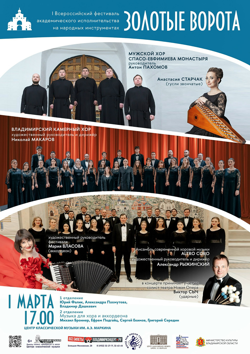 Концерты во Владимире Хоровой концерт01 марта 2026 в 17:00 Открытие I Фестиваля академического исполнительства на русских народных инструментах "Золотые ворота" Исполнители: Владимирский камерный хор Центра классической музыки имени А.Э. Маркина Руководитель - Николай МАКАРОВМужской хор Спасо-Евфимиева монастыря и ансамбль современной хоровой музыки «Altro coro» под управлением Александра РЫЖИНСКОГО Солисты: Анастасия СТАРЧАК | гусли звончатые Мария ВЛАСОВА | аккордеон Цена билета: 750 руб. Билеты по ссылке: https://vk.cc/cUsbTv Дата: 01 марта 2026 Начало: в 17.00 Место проведения: Центр классической музыки имени А.Э. Маркина Адрес: г. Владимир, ул. Большая Московская, д. 28 Информация с https://vk.com/app6819359_-23958279#/event/1849447 « вернуться владимирская афиша другие концерты во Владимире |