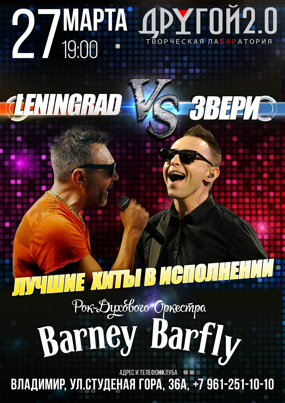 Концерты во Владимире Группа BARNEY BARFLY27 марта 2026 в 19:00 27 марта на сцене бара "Другой 2.0" состоится грандиозное столкновение двух народно- любимых столпов отечественной поп-музыки, группировки Ленинград и Звери! Концерт-битва в исполнении рок-духового оркестра BARNEY BARFLY! БАРНИ БАРФЛАЙ в Другой 2.0 - это синоним настоящего музыкально-танцевального отрыва! Каждое свое выступление они зажигают и зажигают не по-детски, заставляя нас выплясывать, стирать подошвы и ломать каблуки на лабутенах! Так что разминайтесь хорошенько и 27 марта ждем вас в Другой 2.0! Рок-духовой оркестр Барни Барфлай это: - 100% живой звук - харизма и позитивные эмоции - мужской и женский вокал - задорная духовая секция По вашим радостным крикам мы поймём, кого вы любите больше- Ленинград или Звери! Вход: танцпол - от 800р., место за столом - от 1300р Билеты: https://clck.ru/3Rkaib INFO / RESERVE / WhatsApp: +7 961 251 1010 Дата: 27 марта 2026 Двери: с 19.00 Начало: в 21.00Место проведения: Другой Бар 2.0 Адрес: Владимир, ул. Студёная гора, 36А Информация с https://vk.ru/bb_vladimir « вернуться владимирская афиша другие концерты во Владимире |