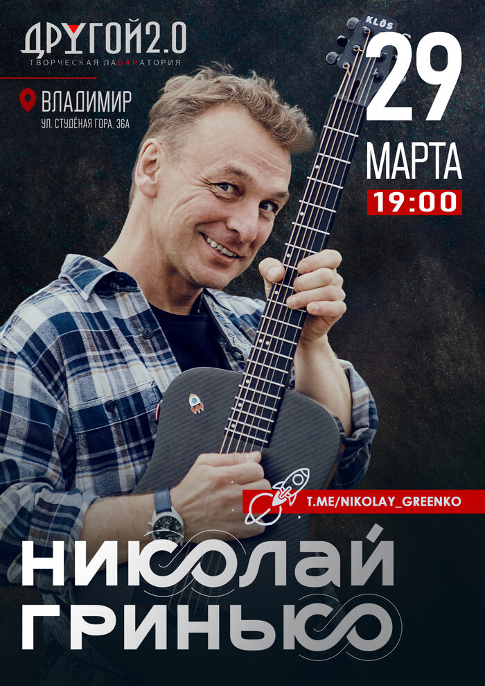 Концерты во Владимире Николай Гринько29 марта 2026 в 19:00 Николай Гринько – автор и исполнитель, в песнях которого сочетаются наивная простота и удивительная глубина образов. Николай играет концерты в технике live-looping, когда с помощью одной гитары прямо на сцене рождается полноценная аранжировка. 29 марта Николай Гринько выступит в Другом Баре 2.0. Начало: в 19.00 Цена билета: от 1600 до 2000 руб. Билеты по ссылке: https://vk.cc/cVkV8u Место проведения: Другой Бар 2.0 Адрес: Владимир, ул. Студёная гора, 36А Информация с https://grinkomusic.ru/#rec1174121801 « вернуться владимирская афиша другие концерты во Владимире |