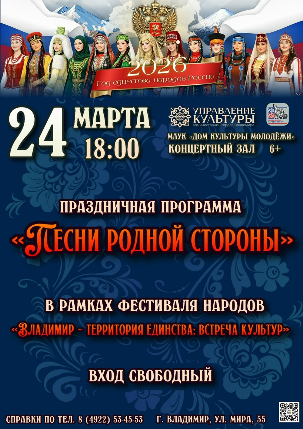 Концерты во Владимире Праздничная программа «ПЕСНИ РОДНОЙ СТОРОНЫ»24 марта 2026 в 18:00 В рамках масштабного культурного фестиваля народов «Владимир – территория единства: встреча культур», 24 МАРТА в «ДОМЕ КУЛЬТУРЫ МОЛОДЁЖИ» пройдёт уникальная праздничная программа под названием «ПЕСНИ РОДНОЙ СТОРОНЫ». Это событие станет настоящим праздником русской культуры и традиций, объединяя народы разных регионов нашей большой страны. Программа обещает подарить незабываемые впечатления благодаря выступлениям лучших артистов и творческих коллективов «Дома культуры молодёжи». Они представят зрителям яркие музыкальные номера, наполненные патриотизмом и любовью к Родине. Особое внимание уделяется сохранению народных традиций и обычаев. В фойе учреждения, гостей будет встречать этнографическая выставка члена Российского фольклорного союза Цигловой Олеси Олеговны, на которой будут представлены подлинные костюмы и элементы быта наших предков. Мероприятие позволит каждому гостю почувствовать себя частью большого русского народа, ощутив тепло родного края и глубину народной мудрости, выраженной в песнях и танцах. Вход свободный. Дат: 24 марта 2026 Начало: в 18.00 Место проведения: Дом культуры молодёжи, концертный зал Адрес: г. Владимир, ул. Мира, 55 Информация с https://vk.ru/wall-51317454_10859 « вернуться владимирская афиша другие концерты во Владимире |