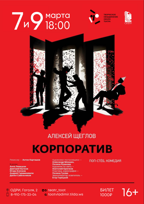 Спектакли во Владимире Спектакль «Корпоратив»07 марта 2025 в 18:00 Устроить праздник всегда непросто, а устроить хороший праздник для женщин — задача почти невыполнимая. В процессе подготовки корпоратива мужской части коллектива приходится отчасти пересмотреть свои взгляды на жизнь, и осознать, окончательно и бесповоротно, что женщины — это наше всё. «Корпоратив» — это признание в любви прекрасной половине человечества. Спектакль поставлен по одноименной пьесе Алексея Щеглова. Режиссер — Антон Карташов. Режиссер по пластике — Полина Гусева Режиссеры-постановщики — Полина Рузанова, Александр Мокшин. В ролях: ПОЛЫХАЕВ, директор офиса — Игорь Клочков ВАСИЛИЙ ЖЕРЕБЦОВ, менеджер по продажам — Дмитрий Бычков СЕМЕН ЕГОРЫЧ, бухгалтер — Андрей Гурамишвили ВАДИК, системный администратор — Данила Савельчиков ТЕТЯ ШУРА, уборщица — Анна Левицкая Билеты по ссылке: https://vmuzey.com/event/spektakl-korporativ Дата: 07 марта 2025 Начало: в 18.00 Место проведения: Владимирский областной Дом работников искусств Адрес: г. Владимир, ул. Гоголя, 2 « вернуться владимирская афиша другие спектакли во Владимире |