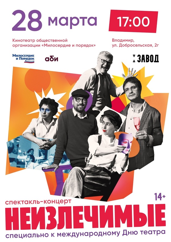 Спектакли во Владимире Спектакль-концерт «Неизлечимые»28 марта 2025 в 17:00 Спектакль ТТ Завод ПОКАЗ 28 марта! Финальный в этом сезоне для Театрального Товарищества Завод. Мы продолжаем готовить сюрпризы! Теперь уже в праздничном особенном спектакле к Международному Дню театра! Спектакль-концерт «Неизлечимые» оказался трансформером)) Удачный эксперимент 7 марта, когда мы добавили авторов и произведения, а так же «подменили» актёра… вдохновил на новые сюрпризы! Ко Дню театра будут снова ДРУГИЕ НЕИЗЛЕЧИМЫЕ! Краткое «содержание» и идея спектакля Александра Блока и других.. В исполнении актёров. Объединяет тематика: о любви с юмором и о юморе с любовью. Приходите за настроением! Наш чудесный фотограф, фотозона, вкусный кофе/чай и пироженки от "Словно в мае" традиционно встретят вас в холле, как и теплая атмосфера. Билеты по ссылке: https://iframeab-pre10267.intickets.ru/seance/55128009 Дата: 28 марта 2025 Начало: в 17.00 Место проведения: Кинотеатр Общественной организации "Милосердие и порядок" Адрес: г. Владимир, ул. Добросельская, 2Г Информация с https://vk.com/wall-206157326_2498 « вернуться владимирская афиша другие спектакли во Владимире |