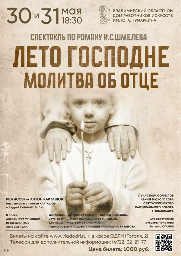 Спектакли во Владимире Спектакль «Лето Господне. Молитва об отце»31 мая 2025 в 18:30 Спектакль по роману И.С.Шмелёва состоится на сцене ОДРИ. Это очередная постановка в рамках проекта «Живое слово». В основе спектакля — роман Ивана Шмелёва «Лето Господне». Режиссер — Антон Карташов В ролях — Андрей Гурамишвили, Анна Левицкая, Игорь Клочков Цена билета: 1000 руб. Билеты по ссылке: https://vmuzey.com/event/spektakl-leto-gospodne-molitva-ob-otce-1 Дата: 31 мая 2025 Начало: в 18.30 Место проведения: Владимирский областной Дом работников искусств Адрес: г. Владимир, ул. Гоголя, 2 Информация с https://vladodri.ru/events/spektakl-leto-gospodne-molitva-ob-otce-2/ « вернуться владимирская афиша другие спектакли во Владимире |