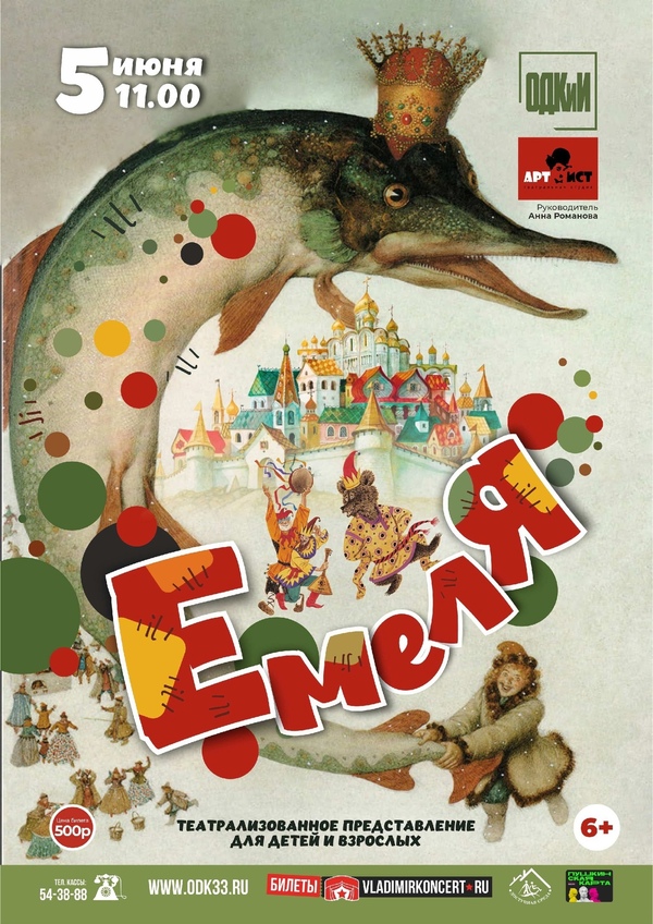 Спектакли во Владимире Спектакль "Емеля"05 июня 2025 в 11:00 Детская театральная студия «Артист» Детская театральная студия «Артист» приглашает посетить представление по мотивам русской народной сказки «По щучьему веленью». Это добрая постановка с волшебством, юмором, веселыми песнями и танцами, которая расскажет историю простого парня, любившего полежать на печи, жизнь которого переворачивается с появлением волшебной щуки. Вот тут-то и начинают происходить настоящие чудеса… Сказка учит юных зрителей мудрости и доброте, а также преподносит ценные уроки жизни. А действительно ли главный герой – дурак, каковым его все считают? Внимание к другим, доброе сердце, уважение не за чины и высокое положение, а за личные качества. В этой мудрой сказке гораздо больше смысла, чем кажется на первый взгляд. продолжительность: 1 час 20 мин. Цена билета: 500 руб. Дата: 05 июня 2025 начало: в 11.00 Место проведения: Областной Дворец культуры и искусства Адрес: г. Владимир, ул. Диктора Левитана, 4 Справки по тел.: +7 (4922) 54-38-88 Информация с https://vk.com/odk33 « вернуться владимирская афиша другие спектакли во Владимире |