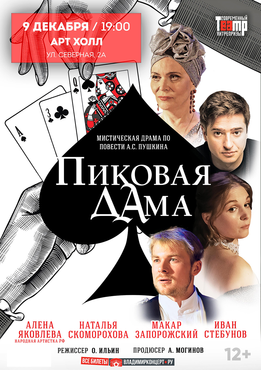 Спектакли во Владимире Спектакль "Пиковая дама"09 декабря 2025 в 19:00 Мистическая драма по повести А. Пушкина. Классический сюжет, традиционные костюмы, но… Режиссер приоткрывает завесу над тайной истории происхождения трех карт. Графиня есть, но кем был граф? Не секрет, что идея и сюжет произведения были подсказаны А. Пушкину князем Голицыным, который однажды отыгрался благодаря совету своей бабушки Н. Голицыной, поставив на три определенные карты. А Голицыной в свое время подсказал эти карты сам Сен-Жермен. В спектакле мастерски переплелись черты романтизма, мистики и реализма. Герман решает разбогатеть любой ценой, но готов ли он уплатить эту цену? Режиссер ставит вопрос о цене выбора: на одной чаше весов выигрыш, на другой - любовь. Что выбирают герои? И что в конечном счете выберет сам зритель? Цена билета: 1800-6000 руб. Билеты без наценки по ссылке: https://nobed.ru/pikovayadama https://vlm.kassir.ru/teatr/pikovaya-dama-42 Дата: 09 декабря 2025 Начало: в 19.00 Место: Art Hall Адрес: г. Владимир, ул. Северная, 2А Информация с https://vk.com/club229461240 « вернуться владимирская афиша другие спектакли во Владимире |