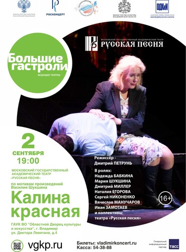 Спектакли во Владимире ГАСТРОЛИ! Спектакль «Калина красная» (16+)02 сентября 2025 в 18:00 Спектакль «Калина красная» в постановке Театра «Русская песня» Музыкальный спектакль по мотивам произведений Василия Шукшина Сюжет этой щемящей душу человеческой истории остался неизменен: вор-рецидивист Егор Прокудин по кличке «Горе», отсидев срок в колонии, отправляется в деревню к Любе Байкаловой, с которой познакомился по переписке. По мнению режиссера-постановщика Дмитрия Петруня, «Калина красная» - история про ту открытость, которой сейчас не хватает, про вечный поиск лучшей жизни, про человека, который хочет насытиться эмоционально, но обретает удовлетворение и настоящее счастье в покое, находит приют на родной земле: «Моя главная задача - уйти от Шукшина хрестоматийного, на основе его текста рассказать свою историю, добиться того, чтобы у зрителей не возникало желания сравнивать спектакль с известным фильмом». «Получив в очередной раз приглашение принять участие в программе «Большие гастроли», мы решили, что отправимся по городам со спектаклем «Калина красная» по рассказам Василия Шукшина, - делится информацией художественный руководитель-директор Московского государственного академического театра «Русская песня», народная артистка России Надежда Бабкина. - Материал сложный, но очень близкий нам по духу и содержанию. Каждое слово Шукшина - чистое, искреннее, в каждом живет душа, боль, любовь, вера, наивность и великая мудрость народа. Накануне гастролей со спектаклем нам удалось посетить места, где снимался легендарный фильм. Ну, чем не знак, что правильной дорогой идем?! Нам очень хочется показать этот дух, мужика настоящего, огромной души человека, который безумно любил свой край, а еще - дать возможность зрителям почувствовать себя единым народом – с корнями, историей, культурой». Фильм «Калина красная» вышел на экраны страны в 1974 году, в котором Василий Шукшин выступил как сценарист, режиссёр и актер. Главную роль в фильме исполнила его жена – актриса Лидия Федосеева-Шукшина. Спустя 40 с лишним лет года в спектакле театра «Русская песня» «заочницу» Любу Байкалову играет их дочь – Мария Шукшина. «Калина красная» – спектакль музыкальный. Музыка дополняет текст Шукшина, раскрывает новые глубинные смыслы, помогает приблизиться к пониманию такой противоречивой и бездонной души русского человека. В исполнении Надежды Бабкиной и коллективов театра звучат лирические, шуточные, хороводные, духовные песни и романсы, которые образуют целый пласт русской традиционной культуры. Той самой культуры, которая ярко и неподражаемо представлена в спектакле «Калина красная». Автор инсценировки – Александр Савицкий Режиссёр – Дмитрий Петрунь Художник-постановщик и художник по костюмам – Евгения Швец Композиторы – Михаил Броннер, Кирилл Бондаренко, Константин Бондаренко Хореограф-постановщик – Павел Ивлев Звукорежиссёр – Денис Барабанов Художники по свету – Наталья Маркович Художник по гриму – Мария Докукина Гримёры-постижеры – Ольга Катасова, Ольга Попова Аранжировщика – Андрей Аренин, Игорь Левченко, группа «После 11» Помощник режиссёра – Алина Лобакова Ассистент художника по гриму – Екатерина Литвина Видеоконтент – «ХО студия» Действующие лица и исполнители: Егор Прокудин – артист театра и кино Дмитрий Миллер Люба Байкалова