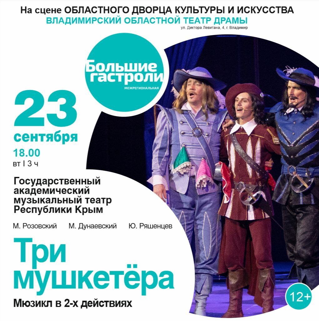 Спектакли во Владимире ГАСТРОЛИ! Мюзикл "Три мушкетера" (12+)23 сентября 2025 в 18:00 Государственный академический музыкальный театр Республики Крым Мюзикл в 2-х действиях Пьеса: М. Розовского Музыка: М. Дунаевского Стихи: Ю. Ряшенцева Кто из нас в детстве не зачитывался романами «Граф Монте-Кристо», «Графиня де Монсоро», «Двадцать лет спустя», принадлежащими перу французского писателя Александра Дюма? И, конечно же, одной из самых увлекательных книг зарубежной литературы, повлиявшей на умы многих людей во всем мире — романом «Три мушкетёра». А кодекс чести героев — один за всех и все за одного — стал крылатой фразой, афоризмом и цитатой не одного поколения. В путешествие по страницам этого авантюрного исторического произведения приглашает театр, представляя мюзикл «Три мушкетёра». Зрители вместе с артистами вспомнят страницы романа и проследят за приключениями героев, рассказом о подвесках, тайной Миледи, трагической любовью Констанции и Д`Артаньяна. Музыку к истории, которая на протяжении почти двух столетий вызывает неугасающий интерес, написал Максим Дунаевский. Пьесу, созданную Марком Розовским и ставшую гимном дружбе четырех отважных мужчин, дополнили стихи Юрия Ряшенцева. Мюзикл «Три мушкетёра» — это яркое и динамичное зрелище для всей семьи, синтез живого вокала, головокружительных танцев, захватывающих боёв на шпагах и пронзительных любовных сцен! Режиссёр-постановщик – засл. деятель искусств РК, лауреат Премии АРК В. Косов Дирижёр-постановщик – засл. деятель искусств РК Э. Мухтерем Художник-постановщик – лауреат Гос. премии РК З. Цирценс Балетмейстер-постановщик – засл. деятель искусств РК, лауреат Гос. премии РК А. Гоцуленко Ассистент балетмейстера – лауреат Гос. премии РК И. Гоцуленко Ассистент режиссёра – засл. арт. АРК Ю. Грищенко Концертмейстеры – Е. Ильюшенок, Л. Трофимова, Л. Чеглакова Продолжительность спектакля: 3 час 00 мин Премьера состоялась: 09.11.2018 г. В ролях: Д’Артаньян — А. Кошелев Атос, королевский мушкетёр — В. Кудрявцев Портос, королевский мушкетёр — М. Дозорец Арамис, королевский мушкетёр — А. Блинов Ришелье, кардинал Франции — В. Лукьянов Миледи, шпионка кардинала — К. Богданова, И. Галенкова, О. Ижболдина Аббатиса, настоятельница монастыря — Л. Васильева, Л. Егорочкина Рошфор, незнакомец из Менга — В. Феклушин Констанция Бонасье — Э. Меметова, А. Печенкина Анна Австрийская, королева Франции — Ю. Блинова, Т. Медведева Людовик XIII — М. Галенков, В. Карпов Герцог Бэкингем — Е. Печенкин, В. Черников Де Тревиль, капитан королевских мушкетёров — А. Фомин, В. Цой Бонасье — В. Антонов-Глебов, И. Юрченко Трактирщик, хозяин харчевни «Старая голубятня» — Ю. Павлов Де Бюзеньи, гвардеец, позже офицер французской армии — А. Бекиров Отец Д’Артаньяна — Ю. Павлов Цена билета: 1200 руб. Действует Пушкинская карта Билеты по ссылке: https://www.vladimirkoncert.ru/shows/event/9307-Tri-mushketera Дата: 23 сентября 2025 Начало: в 18.00 Место проведения: Областной Дворец культуры и искусства Адрес: г. Владимир, ул. Диктора Левитана, д. 4 Информация с http://odk33.ru/afisha/ « вернуться владимирская афиша другие спектакли во Владимире |