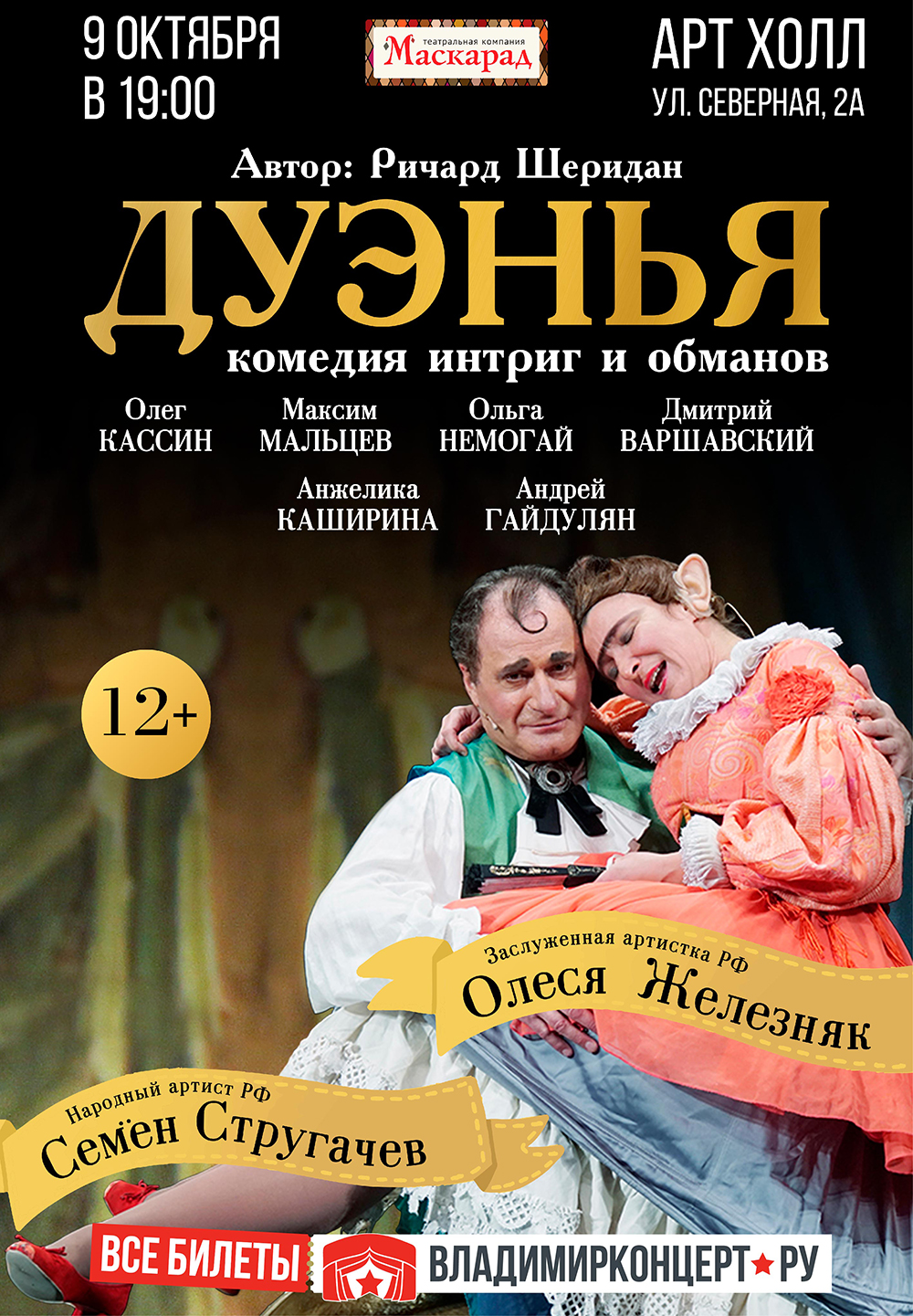 Спектакли во Владимире Спектакль «Дуэнья» (12+)09 октября 2025 в 19:00 Комедия интриг и обманов Что делать, когда знатный отец хочет выдать свою дочь за старого, но богатого? Что делать, когда дочь этого знатного отца любит бедного, но благородного юношу? Что делать, когда дело чести каждого — отстоять свой выбор? И только Дуэнья — воспитательница дочери, решает вмешаться в это противостояние и разом покончить с семейными распрями. Прибрать к своим рукам богатенького старичка, а заодно устроить счастье молодых — разве это не счастливый финал для семейной трагедии? Автор – Ричард Шеридан Режиссер – Роман Самгин Композитор – Иван Замотаев Художник-сценограф – Борис Лысиков - Заслуженный художник РФ Художник по костюмам – Ирина Белоусова, Лауреат премии «Золотая маска» Балетмейстер – Олег Глушков, Лауреат премии «Золотая маска» В ролях: Олеся Железняк - Заслуженная артистка РФ Семен Стругачев - Народный артист РФ Олег Кассин Максим Мальцев Ольга Немогай Дмитрий Варшавский Анжелика Каширина Андрей Гайдулян Продолжительность спектакля 2 часа 40 минут с антрактом Цена билета: 2200-5700 руб. Билеты по ссылке: https://arthall.vladimirkoncert.ru/shows/event/8840-Spektakl-Duenya Дата: 09 октября 2025 Начало: в 19.00 Место: Art Hall Адрес: г. Владимир, ул. Северная, 2А Информация с https://arthall.org/events/spektakl/spektakl-duenya « вернуться владимирская афиша другие спектакли во Владимире |