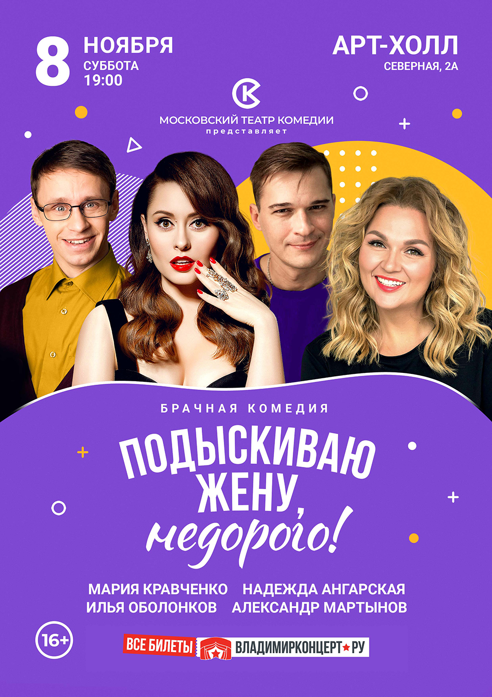 Спектакли во Владимире Спектакль "Подыскиваю жену, недорого!" (16+)08 ноября 2025 в 19:00 Сделать правильный выбор в браке – это одна из главных задач в жизни Игоря, осечки быть не должно и для этого он готов устраивать для претенденток самые невероятные испытания. А побороться есть за что: он успешен и богат, но только не спешит раскрывать все карты. Успешного и богатого полюбит любая, а вот кто полюбит мелкого служащего с низким окладом и скромной однокомнатной квартирой, в которой, кстати, все и происходит. Игорю кажется, что правильный выбор сделан, но жизнь преподносит сюрпризы, о которых и не мечтаешь: люди оказываются совсем не теми, за кого себя выдают, и счастье было рядом, но не было замечено… К счастью для нашего героя все заканчивается хорошо! Актерский состав: Мария Кравченко Надежда Ангарская Илья Оболонков Александр Мартынов Продолжительность: 1 час 45 минут Цена билета: 1900-4700 руб. Билеты по ссылке: https://vladimirkoncert.ru/shows/event/9397-Podyskivayu-zhenu-nedorogo Дата: 08 ноября 2025 Начало: в 19.00 Место: Art Hall Адрес: г. Владимир, ул. Северная, 2А Информация с https://arthall.org/events/spektakl/podyskivayu-zhenu-nedorogo « вернуться владимирская афиша другие спектакли во Владимире |