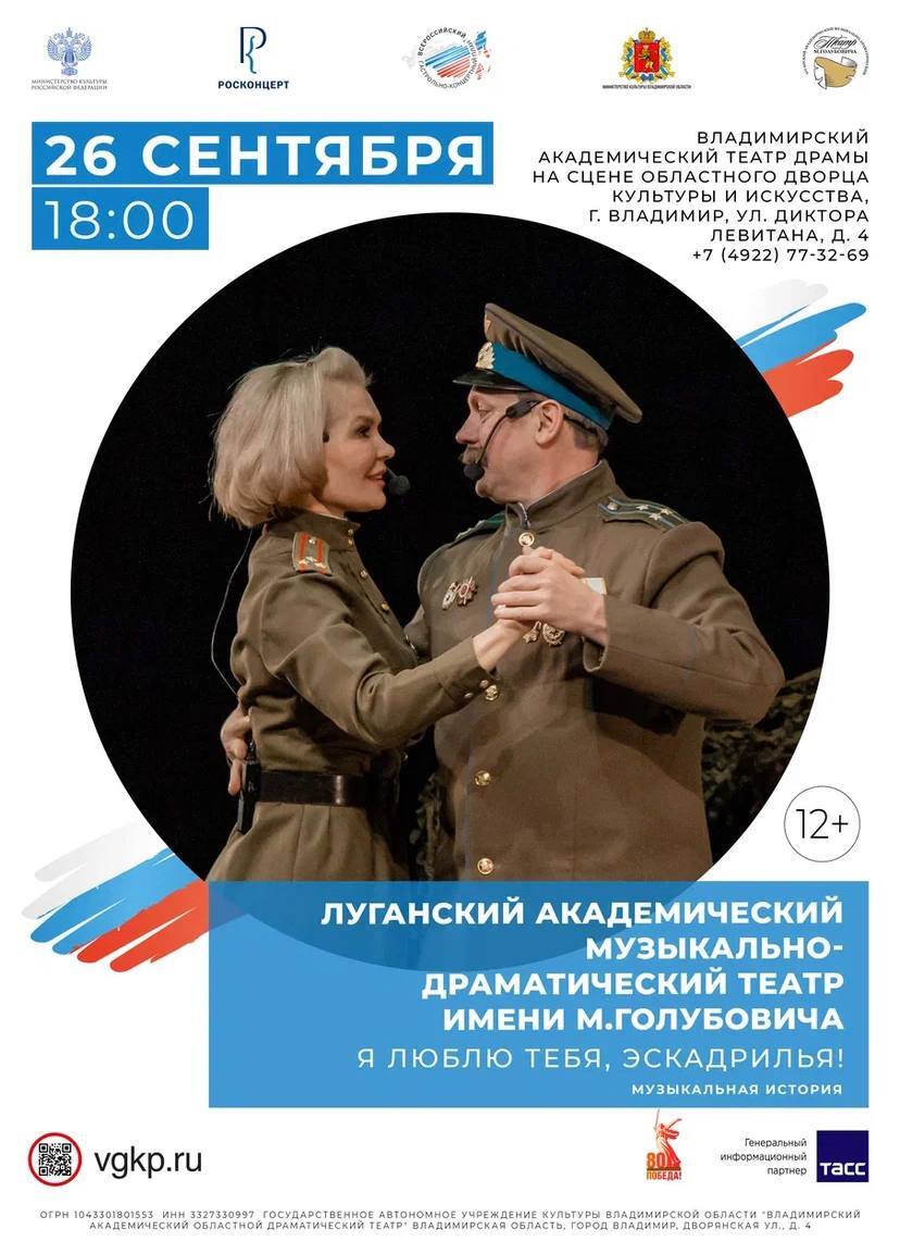 Спектакли во Владимире ГАСТРОЛИ! Музыкальная история "Я люблю тебя, эскадрилья!"26 сентября 2025 в 18:00 Луганский академический музыкально-драматический театр имени М. Голубовича "Большие гастроли" во Владимире Луганский академический музыкально-драматический театр имени М. Голубовича 26 сентября "Я люблю тебя, эскадрилья!", музыкальная история, 12+ Место проведения: Владимирский областной Дворец культуры и искусства Адрес: г. Владимир, ул. Диктора Левитана, д.4 Начало в 18.00 Билеты по ссылке: https://clck.ru/3Nsb7n Информация с https://vk.com/wall-89824949_6903 « вернуться владимирская афиша другие спектакли во Владимире |