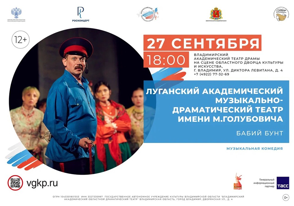 Спектакли во Владимире ГАСТРОЛИ! Музыкальная комедия "Бабий бунт"27 сентября 2025 в 18:00 Луганский академический музыкально-драматический театр имени М. Голубовича "Большие гастроли" во Владимире Луганский академический музыкально-драматический театр имени М. Голубовича 27 сентября "Бабий бунт", музыкальная комедия, 12+ Место проведения: Владимирский областной Дворец культуры и искусства Адрес: г. Владимир, ул. Диктора Левитана, д.4 Начало в 18.00 Билеты по ссылке: https://clck.ru/3NthGV Информация с https://vk.com/wall-89824949_6909 Информация с « вернуться владимирская афиша другие спектакли во Владимире |