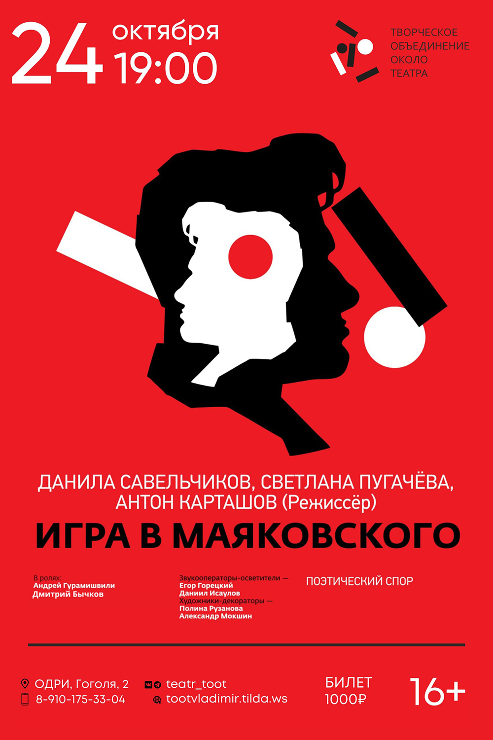 Спектакли во Владимире Спектакль «Игра в Маяковского»24 октября 2025 в 19:00 Камерный театр Т.О.О.Т. Спектакль «Игра в Маяковского» — это театральная версия автобиографии Маяковского «Я сам» в дополнении стихов и неопровержимых фактов. Постановка будет интересна зрителю благодаря необычному формату и позволит узнать о разных гранях таланта Владимира Маяковского. В ролях — Андрей Гурамишвили, Дмитрий Бычков Режиссер спектакля — Антон Карташов Цена билета: 1000 рублей Билеты по ссылке: https://vk.cc/cQiuaS Дата: 24 октября 2025 Начало: в 19.00 Место проведения: Владимирский областной Дом работников искусств Адрес: г. Владимир, ул. Гоголя, 2 Информация с https://vladodri.ru/events/spektakl-igra-v-majakovskogo-6/ « вернуться владимирская афиша другие спектакли во Владимире |