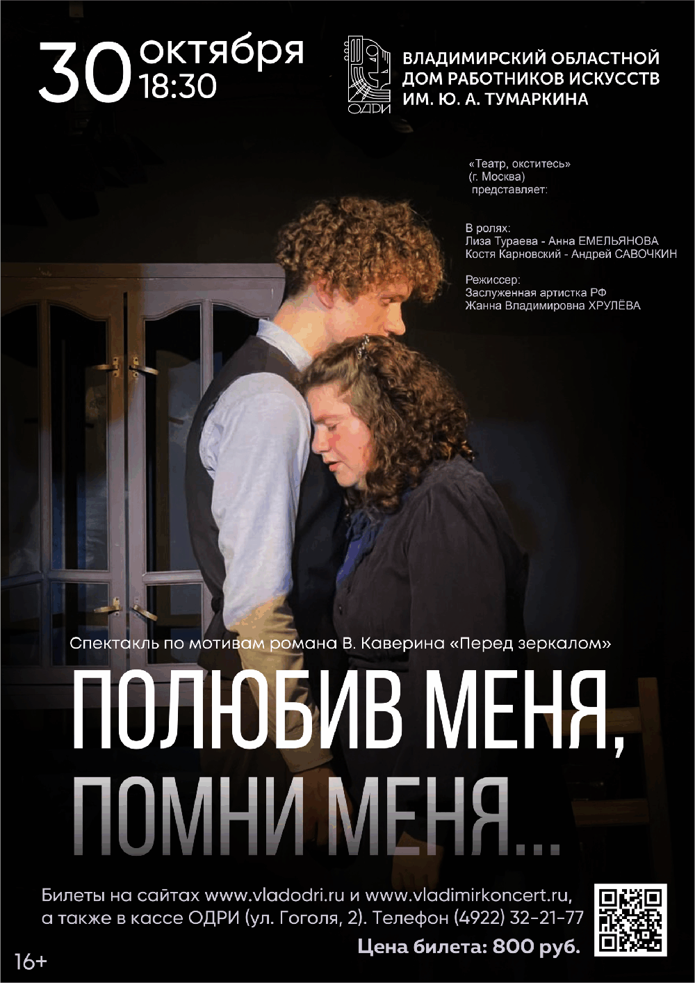 Спектакли во Владимире Спектакль «Полюбив меня, помни меня…»30 октября 2025 в 18:30 Она — Лиза Тураева, художница с обострённым чувством свободы. Он — Константин Карновский, человек разума и логики. Их история начинается с юношеского балa и продолжается через письма, разлуки, страны, войны и революции в течение более 20 лет. Спектакль по мотивам романа В. Каверина «Перед зеркалом» представляет «Театр, окститесь» (г. Москва) В ролях: Лиза Тураева — Анна ЕмельяноваКостя Карновский — Андрей Савочкин Режиссер — Заслуженная артистка РФ Жанна Владимировна Хрулёва Цена билета: 800 рублей Билеты по ссылке: https://vk.cc/cQ5Noi Дата: 30 октября 2025 Начало: в 18.30 Место проведения: Владимирский областной Дом работников искусств Адрес: г. Владимир, ул. Гоголя, 2 Информация с https://vladodri.ru/events/spektakl-poljubiv-menja-pomni-menja-2/ « вернуться владимирская афиша другие спектакли во Владимире |