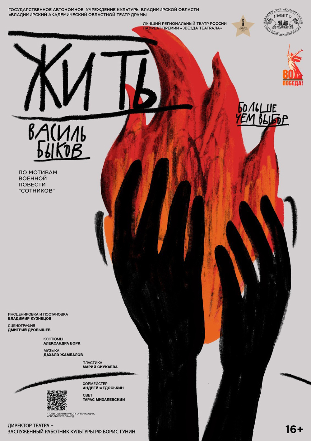 Спектакли во Владимире Спектакль "ЖИТЬ"27 октября 2025 в 18:00 Больше чем выбор Драма по мотивам повести Василя Быкова «Сотников» Премьера спектакля состоялась 26 марта 2025 года События драмы происходят в оккупированной фашистами Белоруссии, где масштабная героическая партизанская борьба, как известно, сыграла значительную роль в победе над захватчиками. Два партизана - Сотников и Рыбак. Сотников в мирное время был учителем, на войне стал офицером, командиром гаубичной батареи. В неравном бою с немецкими танками попал в плен. Отчаянная дерзость и везение помогли ему бежать из лагеря военнопленных. Так он попал к партизанам. Рыбак - местный уроженец, на фронте служил старшиной стрелковой роты, после разгрома своей воинской части подался в родные места и ушел в партизанский отряд. «Рядовой поход за провизией» для партизанского отряда оказался для Рыбака и Сотникова роковым. Смекалистый, сильный и практичный Рыбак производит впечатление человека более склонного к героическому поступку, нежели болезненный, интеллигентный Сотников. Но жизнь распорядилась иначе. Проблема выбора перед лицом смерти развернула эти характеры неожиданной гранью. Потому что у одного есть понятие чести, порядочности, обострённое чувство Родины. А у другого — неистовая жажда «ЖИТЬ!»… т.е. выжить любой ценой. И это... лишает его человеческой сути. Самого смысла жизни. В 1976 году повесть экранизирована. Легендарный фильм Ларисы Шепитько «Восхождение» не оставлял весам Фемиды права колебаться в оценке понятий «подвиг» и «предательство». Однако сама повесть, увидевшая свет в 1970 в журнале «Новый мир», но не утратившая актуальности, в авторской версии по-прежнему провоцирует на размышления. Внутренний мир героев открыт для читателя. Василь Быков не даёт им конкретной оценки, хладнокровно отдавая на суд читателя. И этот приём подхватывает постановщик спектакля Владимир Кузнецов, для которого повесть Василя Быкова больше, чем книга о Войне. Для него это огромное, развёрнутое исследование Души человеческой в контексте тяжелых трагических испытаний — НА ВСЕ ВРЕМЕНА. Длительность спектакля 1ч. 40 мин. (без антракта) Спектакль предназначен для зрителей старше 16 лет Цена билета: 700-800 руб. Билеты по ссылкам: https://vladimir.kassy.ru/events/teatr/2-2222/ https://vladimirkoncert.ru/shows/event/9965-ZHita Дата: 27 октября 2025 Начало: в 18.00 Место проведения: Владимирский академический областной драматический театр Адрес: г. Владимир, ул. Дворянская, д. 4 Информация с https://www.dramavladimir.ru/playbill#oktyabr « вернуться владимирская афиша другие спектакли во Владимире |