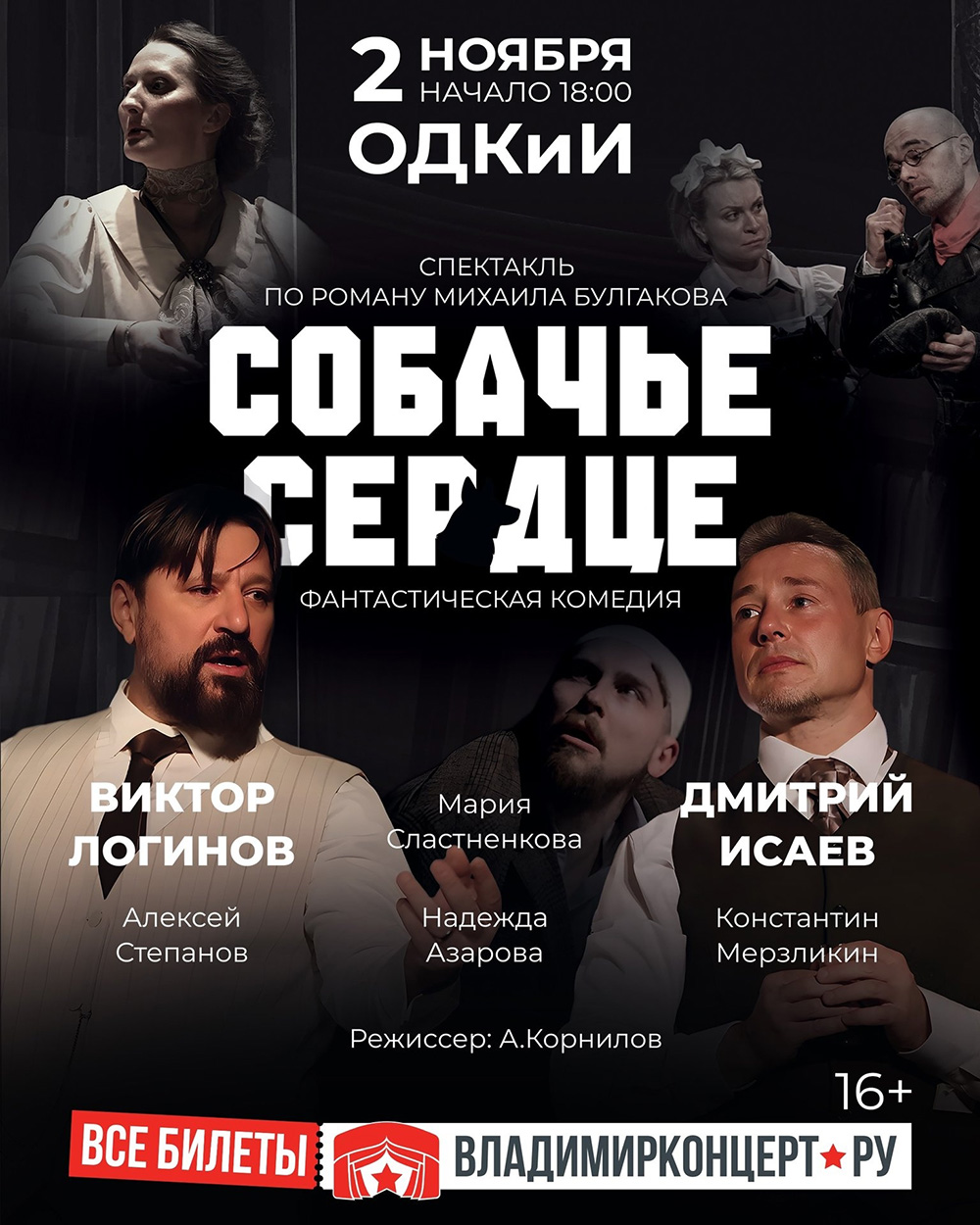 Спектакли во Владимире Спектакль «Собачье сердце»02 ноября 2025 в 18:00 Премьера сезона – «Собачье сердце» с Виктором Логиновым Встречайте новую интерпретацию культового произведения Михаила Булгакова – спектакль «Собачье сердце» в постановке режиссера Антона Корнилова. На сцене вас ждет незабываемая игра ведущих артистов московских театров и известных киноактеров, воплощающих образы знаменитых булгаковских персонажей. История произведения Булгакова Написанное в 1925 году, «Собачье сердце» долгое время оставалось под запретом и распространялось только в самиздате. Лишь спустя 60 лет мир увидел эту сатирическую повесть, особенно полюбившуюся благодаря одноименному фильму с Евгением Евстигнеевым. Сегодня история о превращении пса Шарика в человека вдохновляет именитых театральных режиссеров на новые прочтения, одно из которых мы представляем вашему вниманию. Сюжет: остроумная сатира и актуальные вопросы На сцене развернется остроумная история сложного эксперимента профессора Преображенского, благодаря которому подопытный пес Шарик превращается в человека — Полиграфа Полиграфыча Шарикова. Сенсационное открытие приносит профессору признание, но его радость оказывается недолгой: личность Шарикова обнажает болезненные вопросы общества и оставляет под сомнением саму суть человеческой природы. Булгаковская сатира и глубокие философские вопросы остаются актуальными и в современности. Звездный состав и уникальное музыкальное оформление В роли профессора Преображенского – Виктор Логинов, известный зрителям по фильмам и сериалу «Счастливы вместе», «Букины». Роль доктора Борменталя исполнит Дмитрий Исаев, завоевавший популярность в таких проектах, как «Бедная Настя» и «Детектив на миллион». Музыкальное сопровождение создано композитором Ярославом Сапожинским специально для этого спектакля, усиливая драматичность и уникальную атмосферу произведения Булгакова. Цена билета: 1700-3700 руб. Билеты по ссылке: https://vladimirkoncert.ru/shows/event/9300-Spektakl-Sobache-serdtse Дата: 02 ноября 2025 Начало: в 18.00 Место проведения: Областной Дворец культуры и искусства Адрес: г. Владимир, ул. Диктора Левитана, д. 4 Информация с http://odk33.ru/afisha/ « вернуться владимирская афиша другие спектакли во Владимире |