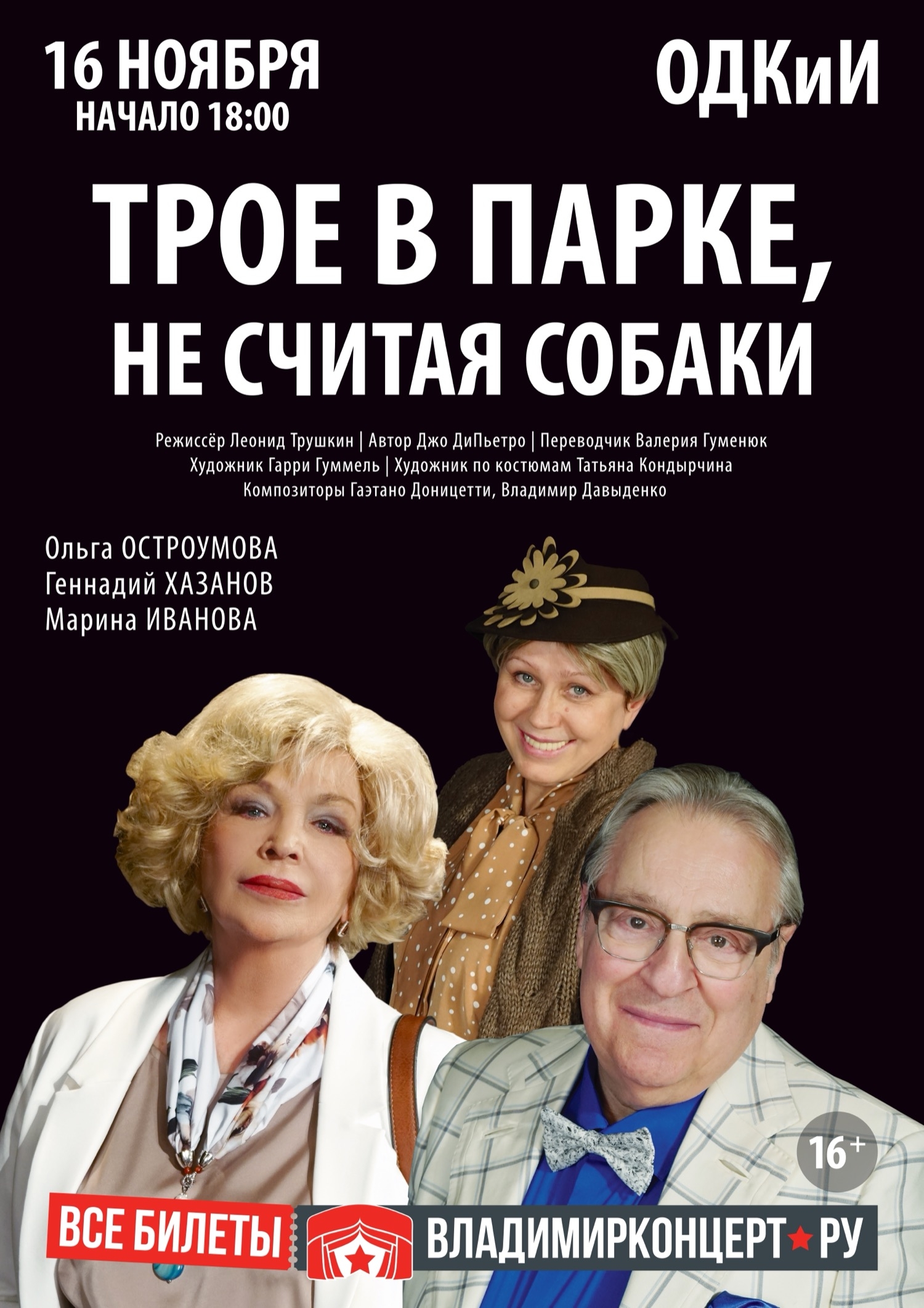 Спектакли во Владимире Спектакль «Трое в парке, не считая собаки»16 ноября 2025 в 18:00 Любимцы публики разыгрывают историю знакомства Ральфа и Кэрол. Ему за 80, ей за 70. Они встречаются в парке, где выгуливают собак. Он спросил – она не ответила, он пошутил – она не засмеялась. Так и познакомились… Есть в истории и тот самый «третий лишний», и это вовсе не пёс Персик, а сестра Ральфа, которая приехала заботиться о нём. Она мешает дружбе брата с Кэрол. Но поведётся ли пара на её интриги? Выстоит? В истории знакомства немолодых людей фраза за фразой обнажаются их непростые судьбы, жизнь, полная компромиссов, не сбывшихся надежд и не исполненных желаний. Режиссёр Леонид Трушкин В ролях: Геннадий Хазанов, Ольга Остроумова, Марина Иванова. Продолжительность спектакля: 1 час 30 мин без антракта Возрастное ограничение: 16+ Цена билета: 2100-6000 руб. Билеты по ссылке: https://vladimirkoncert.ru/shows/event/9386-Spektakl-Troe-v-parke-ne-schitaya-sobaki Дата: 16 ноября 2025 Начало: в 18.00 Место проведения: Областной Дворец культуры и искусства Адрес: г. Владимир, ул. Диктора Левитана, д. 4 Информация с http://odk33.ru/afisha/ « вернуться владимирская афиша другие спектакли во Владимире |