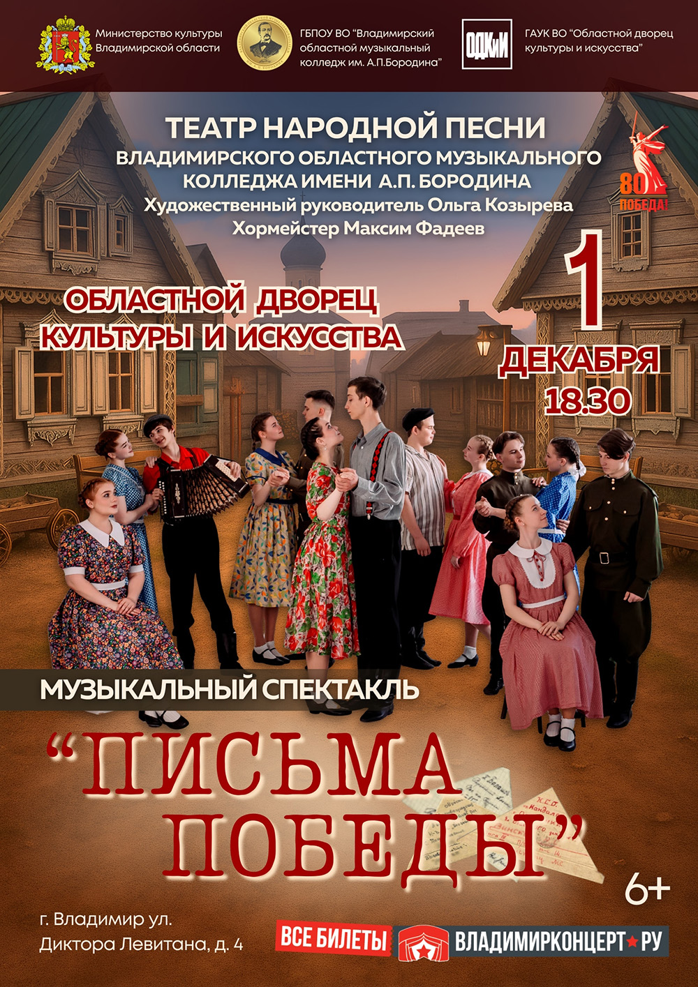 Спектакли во Владимире Музыкальный спектакль «Письма Победы»01 декабря 2025 в 18:30 Впервые на базе Владимирского Областного Музыкального Колледжа имени А.П. Бородина создан уникальный проект «Театр народной песни» (художественный руководитель Ольга Козырева, хормейстер Максим Фадеев). 1 декабря 2025 года в ГАУК "Областном Дворце культуры и искусства» состоится показ музыкального спектакля «Письма Победы», посвященного Году Защитника Отечества и 80-летию Победы в Великой Отечественной войне. Артисты театра: лауреаты и обладатели Гран-при всероссийских и международных конкурсов народно-певческого искусства, обладатели Гран-при всероссийского хорового фестиваля – 2024 «Лучший народный хор России», победители самого масштабного проекта страны «Ну-ка, все вместе! Хором!» на телеканале «Россия-1» - студенты и выпускники Владимирского областного музыкального колледжа им. А.П. Бородина. Великая Отечественная война - страшная страница в судьбах советских людей и в жизни каждой семьи нашей Родины. У многих из нас есть бабушки и дедушки, которые ковали победу на фронте или в тылу. В каждой семье есть свой Герой, его особая история. Наша история о совсем юных девушке Ане и её женихе Ване, на долю которых выпало одновременно тяжёлое и светлое бремя: ВОЙНА и ЛЮБОВЬ. Цена билета: 600-1100 руб. Билеты по ссылке: https://vk.cc/cR8kOB Дата: 01 декабря 2025 Начало: в 18.30 Место проведения: Областной Дворец культуры и искусства Адрес: г. Владимир, ул. Диктора Левитана, д. 4 Информация с https://vk.com/club3699295 « вернуться владимирская афиша другие спектакли во Владимире |