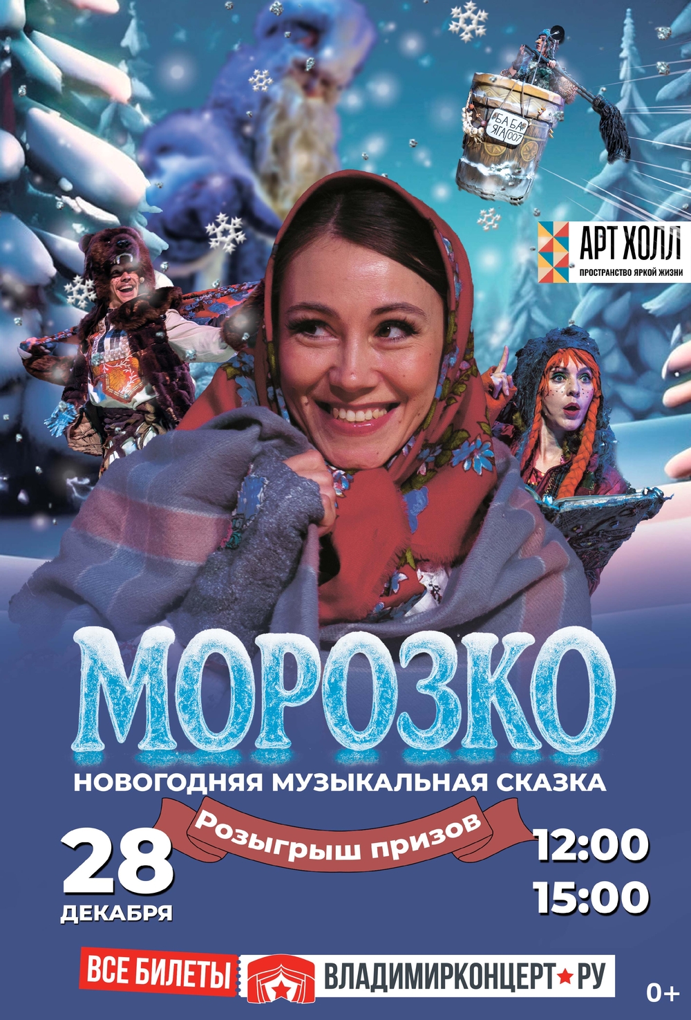 Спектакли во Владимире Новогодняя-музыкальная сказка «Морозко» (0+)28 декабря 2025 в 12:00 Современный театр Мюзикла представляет. Новогодняя-музыкальная сказка «Морозко» С детства нам знаком сюжет этой чудесной сказки. Начнётся история в зимнем лесу у избушки на курьих ножках. У Бабы Яги живут добрая, трудолюбивая Настенька и ленивая, капризная Марфушка. Колдовство Бабы Яги должно привести сюда Принца - какая же сказка без настоящей любви?! По воле обстоятельств обе девушки отправятся в лес и повстречают там Морозко. Помогать Морозко будет Медведь, которого с помощью зрителей придётся разбудить, вызвав из зимней спячки. Удастся ли Марфушке исправиться? Удастся ли девушкам встретиться с Принцем? Удастся ли Морозко восстановить добро и справедливость? Это вы узнаете, посмотрев сказку. Все герои поют и танцуют. Красивые костюмы и декорации, интерактивные сцены, волшебство и превращения - всё зовёт нас побывать в доброй сказке и снова ощутить атмосферу новогоднего трепета, когда Чудеса сбываются! Вас ждет Розыгрыш призов: сладкие подарки, мягкие игрушки и многое другое. Дети до 3-х лет (включительно) бесплатно, без предоставления отдельного места. При покупке 10 билетов, 1 сопровождающий бесплатно. Цена билета: 500-2600 руб. Билеты по ссылке: https://vladimirkoncert.ru/shows/event/9267-MOROZKO Дата: 28 декабря 2025 Начало: в 12.00 Место: Art Hall Адрес: г. Владимир, ул. Северная, 2А Информация с https://arthall.org/events/spektakl/morozko-2 « вернуться владимирская афиша другие спектакли во Владимире |