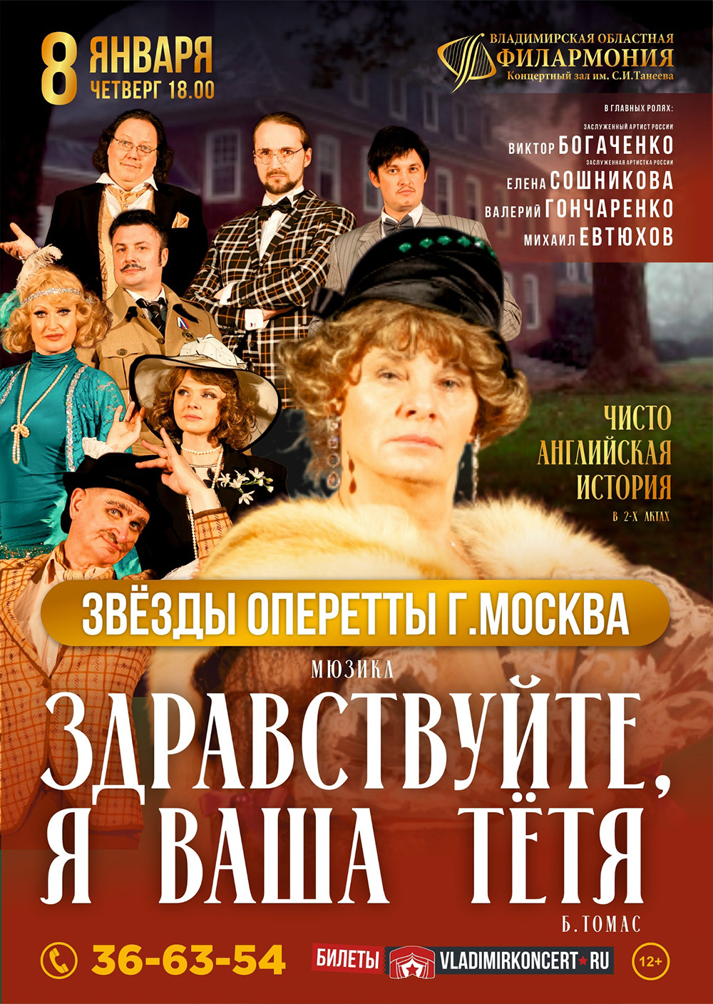 Спектакли во Владимире Мюзикл «Здравствуйте, я ваша тетя!»08 января 2026 в 18:00 Музыкальный фарс в английском стиле в 2-х актах. Невероятная, искрометная история в исполнении ведущих солистов Московской оперетты! Постановка: Заслуженный артист России Виктор Богаченко. В доме полковника сэра Френсиса Чеснея ждут приезда богатой вдовы Доны Розы Д,Альвадорес, тетушки Чарли. Гости приглашены, но миллионерша не приехала! Что делать? Срочно нужно найти тетю! На помощь приходит Лорд Баберлей, согласившись исполнить роль тёти на торжественном приеме. Череда смешных перевоплощений и нелепых ситуаций держит зрителя в напряжении до самого финала. На руку миллионерши претендует судья Кригс и полковник Чесней. Кого выберет Дона Роза? Страсти накаляются! И тут появляется настоящая Дона Роза и не одна..... В ролях: Бабс – Заслуженный артист России Виктор Богаченко Полковник - Михаил Евтюхов Кригс - Валерий Гончаренко Донна Роза – Заслуженная артистка России Елена Сошникова Элла - Екатерина Чудотворова Джек - Виктор Леонтьев Чарли - Никита Борисов Китти - Елена Соколова Энни - Мария Остапова Брассет - Юрий Зальцман Продолжительность: 2 часа 10 минут с антрактом Цена билета: 900-1800 руб. Билеты по ссылке: https://vk.cc/cQ4qxU Дата: 08 января 2026 Начало: в 18.00 Место проведения: Владимирская областная филармония Адрес: г. Владимир, проспект Ленина, дом 1 Информация с https://vk.ru/vladfilarm « вернуться владимирская афиша другие спектакли во Владимире |