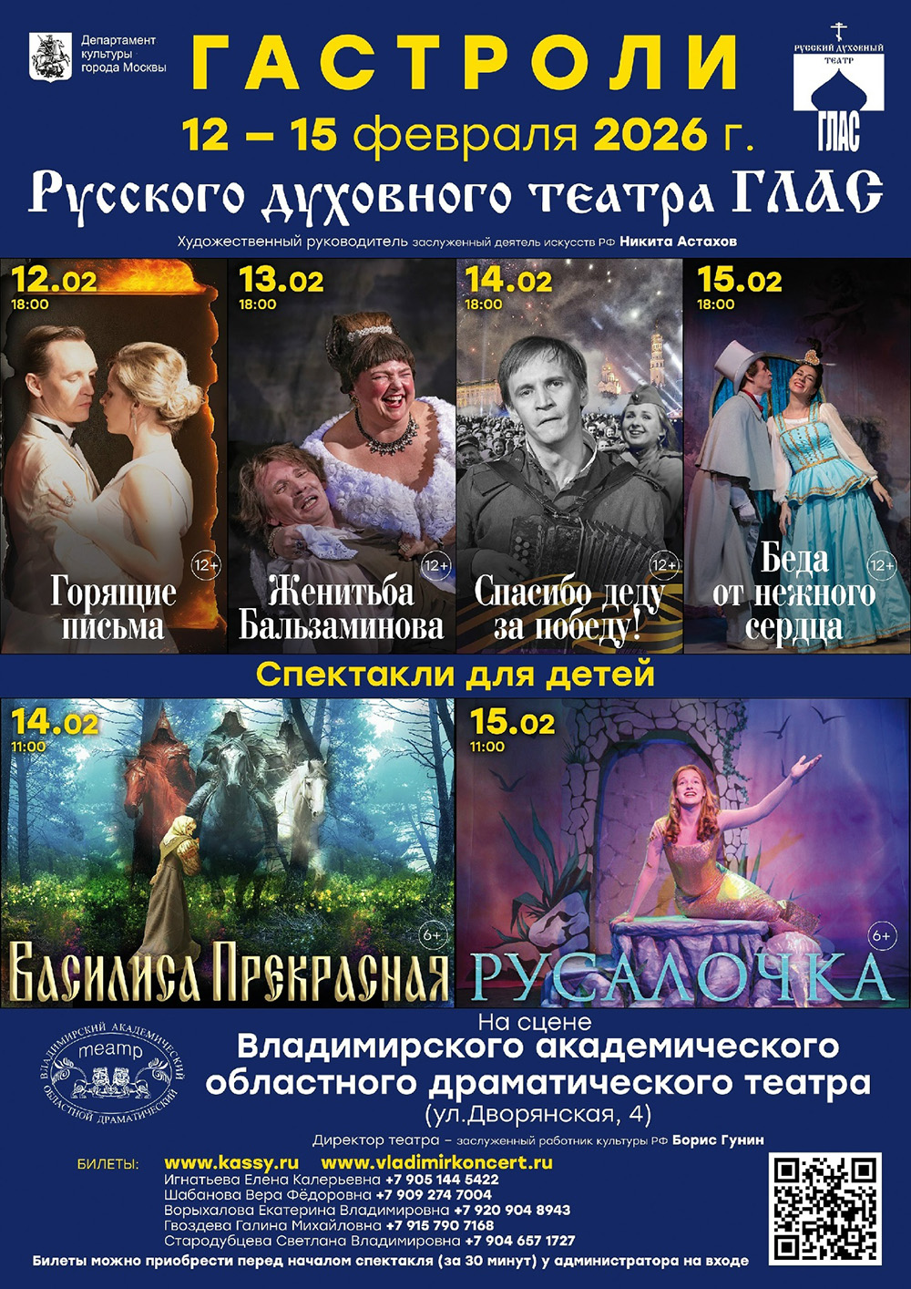 Спектакли во Владимире Спектакль "Русалочка" (6+)15 февраля 2026 в 11:00 ГАСТРОЛИ МОСКОВСКОГО ТЕАТРА "ГЛАС" Спектакль проходит на большой сцене Владимирского академического театра драмы. Приходите в театр, и вы увидите прекрасную, нежную и очень светлую историю такой, как, нам кажется, и задумал её автор, великий и добрый Ганс Христиан Андерсен. В советское время эта сказка лишилась самого главного – христианского мировоззрения автора. Вот и осталось в памяти, что Русалочка мечтала получить ноги взамен хвоста и погибла. А мечтала она получить бессмертную душу. Именно об этом говорилось в самом первом издании Г.Х. Андерсена 1837 года! Более того, финал у этой истории счастливый! Спектакль – участник гастролей в Берлине (2018 год), Калининграде (2018 год), Белграде (2018 год), Республике Кипр (2019 год), Риге (2019 год). Гастроли проходили при поддержке Министерства культуры РФ. Продолжительность спектакля 1 час. Премьера состоялась 20 декабря 2017 года. Билеты по ссылке: https://vladimir.kassy.ru/events/teatr/2-2294/ https://vladimirkoncert.ru/shows/event/10483-Rusalochka Дата: 15 февраля 2026 Начало: в 11.00 Место проведения: Владимирский академический театр драмы, большая сцена Адрес: г. Владимир, ул. Дворянская, д. 4 Информация с https://www.dramavladimir.ru/playbill#fevral « вернуться владимирская афиша другие спектакли во Владимире |