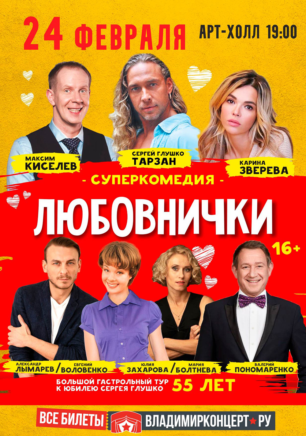 Спектакли во Владимире Спектакль «Любовнички»24 февраля 2026 в 19:00 Гастроли Московского театра с суперкомедией! В ролях: - Максим Киселев (шоу «Однажды в России», «Иван Васильевич меняет всё!», «Камера Мотор») - Сергей Глушко («Ночная смена», Девичник, т/с «Закон Каменных Джунглей», «Этаж») - Александр Лымарев («Новенький», «Похищение Евы», «Обручальное кольцо», «Солдаты») / Евгений Воловенко («По законам военного времени», «Искушение», «Средство от разлуки», «Подозрение» «Деффчонки», «Обручальное кольцо») - Карина Зверева («Полярный», «Отель Элеон», «Беспринципные», «СашаТаня») - Юлия Захарова («Счастливы вместе», «Водяная», Бальзаковский возраст, или Все мужики сво... -1») / Мария Болтнева («Эксклюзив», «Доктор Рихтер», «Карпов-2», «Глухарь», «Не родись красивой») - Валерий Пономаренко (участник ТВ-шоу «Аншлаг» и «Кривое зеркало») В этой невероятно смешной истории происходит столько неожиданных ситуаций, которые будут вызывать у зрителей продолжительный хохот, что это просто невозможно пересказать… Это надо увидеть своими глазами! Спектакль наполнен невероятным количеством юмора и множеством гомерически смешных перевоплощений мужчин в женщин, и наоборот, чего до сих пор ещё не было на сцене! Зрители, посмотрев один раз нашу комедию, захотят снова и снова увидеть её, чтоб вновь получить невероятное удовольствие и мощную вакцину смехотерапии. Цена билета: 1700-3700 руб. Билеты по ссылке: https://www.vladimirkoncert.ru/shows/event/9228-Lyubovnichki Дата: 24 февраля 2026 Начало: в 19.00 Место: Арт Холл Адрес: г. Владимир, ул. Северная, 2А Информация с https://arthall.org/events/spektakl/lyubovnichki « вернуться владимирская афиша другие спектакли во Владимире |