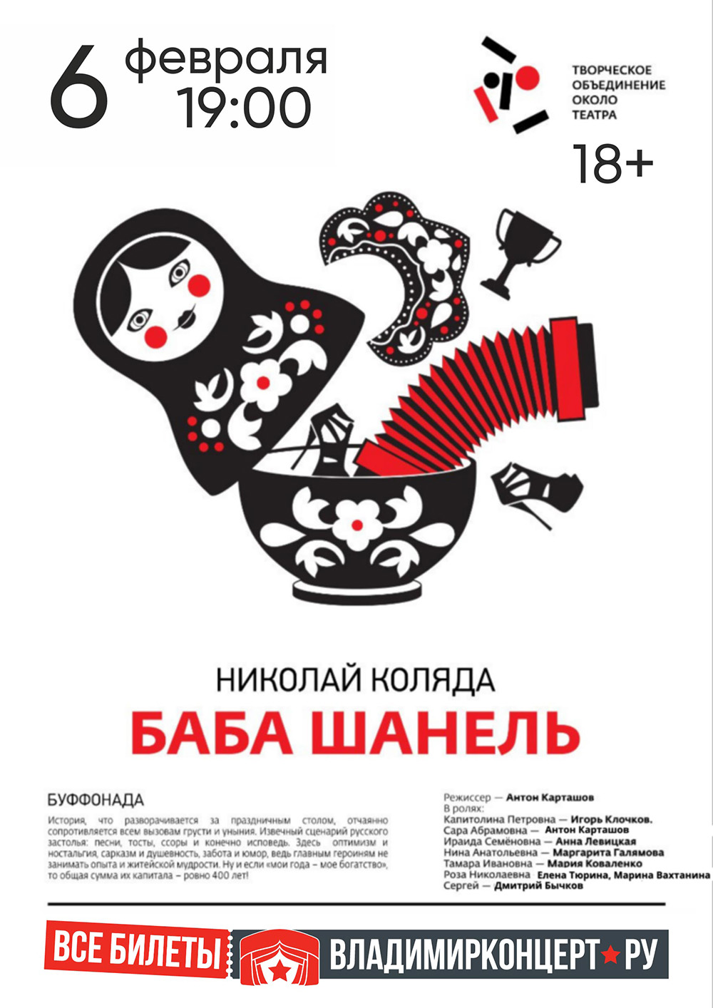 Спектакли во Владимире Спектакль «Баба Шанель»06 февраля 2026 в 19:00 Камерный театр Т.О.О.Т. История, что разворачивается за праздничным столом, отчаянно сопротивляется всем вызовам грусти и уныния. Извечный сценарий русского застолья: песни, тосты, ссоры и конечно исповедь. Здесь оптимизм и ностальгия, сарказм и душевность, забота и юмор, ведь главным героиням не занимать опыта и житейской мудрости. Ну и если «мои года — мое богатство», то общая сумма их капитала — ровно 400 лет! Действующие лица: Капитолина Петровна — Игорь Клочков Сара Абрамовна — Антон Карташов Ираида Семеновна — Анна Левицкая Нина Андреевна — Маргарита Галлямова Тамара Ивановна — Мария Коваленко Роза Николаевна — Елена Тюрина/Марина Вахтанина Сергей — Дмитрий Бычков Режиссер спектакля — Антон Карташов В двух действиях с антрактом. Цена билета: 1200 руб. Билеты в кассе ОДРИ и по ссылке: https://vladimirkoncert.ru/shows/event/10538-Spektakl-kamernogo-teatra-T-O-O-T-Baba-SHanel Дата: 30 января 2026 Начало: в 19.00 Место проведения: Владимирский областной Дом работников искусств Адрес: г. Владимир, ул. Гоголя, 2 Информация с https://vladodri.ru/events/spektakl-baba-shanel-5/ « вернуться владимирская афиша другие спектакли во Владимире |