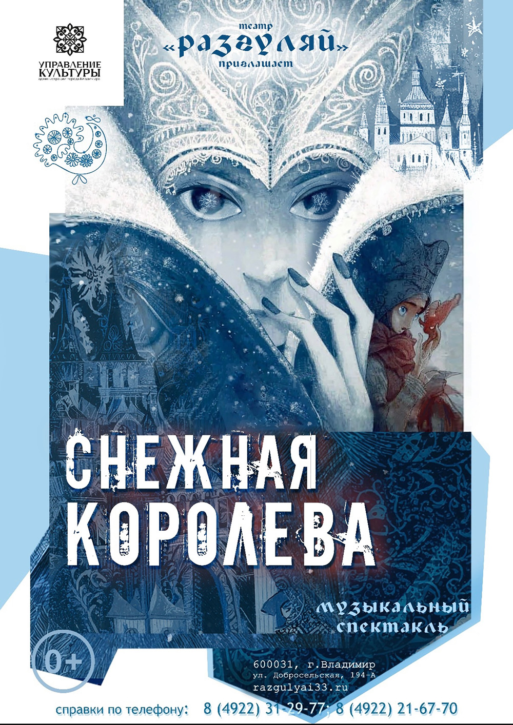 Спектакли во Владимире Музыкальный спектакль для детей «Снежная королева»01 марта 2026 в 11:00 Спектакль по мотивам произведения знаменитого сказочника Ганса Христиана Андерсена. Добрая сказка о верности, дружбе и любви органично вписалась в современную действительность. Отважная Герда не раздумывая отправляется на поиски своего названного брата Кая, которого похитила Снежная королева. Повествователи сказки вступают в диалог с героями, разбойники становятся добрыми, поют и играют со зрителями. На сцене расцветают волшебные цветы и, как всегда, добро побеждает. Старая истина - в жизни всегда должно быть место подвигу, верности и дружбе. Ребенок и взрослый увлеченно будут следить за приключениями героев сказки. Цена билета: 500 руб. Онлайн билеты по ссылке: https://quicktickets.ru/vladimir-teatr-razgulyaj/s586 Дата: 01 марта 2026 Начало: в 11.00 Место проведения: Музыкальный Театр «Разгуляй» Адрес: Адрес: г. Владимир, ул. Добросельская, д. 194-а Телефон для справок:8 (4922) 31-29-77, 21-67-70 Информация с http://razgulyai33.ru/afishi/ « вернуться владимирская афиша другие спектакли во Владимире |
