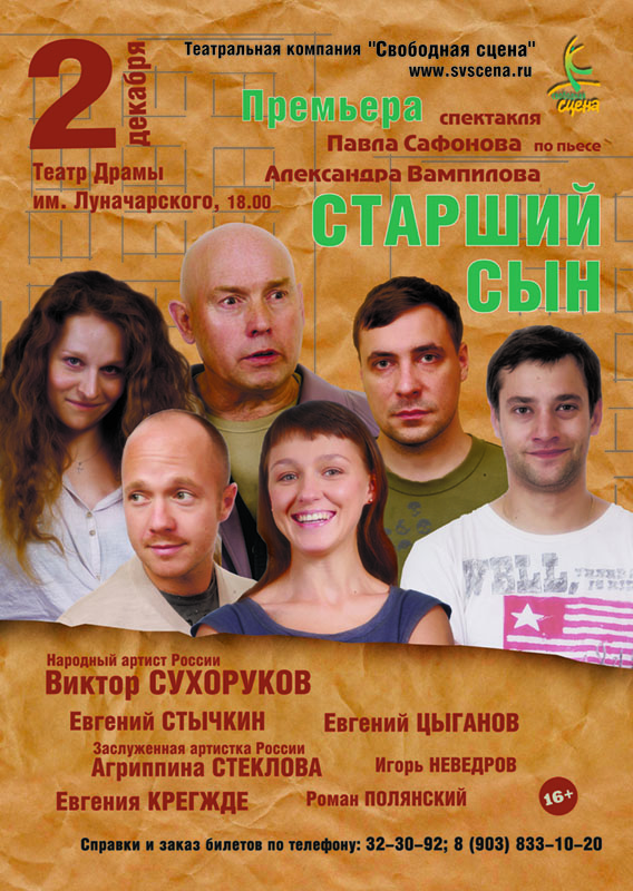 Спектакли во ВладимиреПремьера спектакля «Старший сын»02 декабря 2012 в 18:00 2 декабря на сцене Театра Драмы вас ждет премьерный показ спектакля «Старший сын» ![]() 2 декабря на сцене Театра Драмы вас ждет премьерный показ спектакля «Старший сын» по пьесе классика советской драматургии Александра Вампилова. В этом году Вампилову исполнилось бы 75 лет! Пьеса очень известная, любимая всеми телезрителями Советского Союза по экранизации с одноименным названием, в которой главные роли блистательно исполнили Евгений Леонов, Николай Караченцев, Михаил Боярский, Светлана Крючкова. Актерский состав: народный артист России Виктор Сухоруков, талантливые Евгений Цыганов и Евгений Стычкин, звезды театров Вахтангова и «Сатирикона» (соответственно) Евгения Крегжде и Агриппина Стеклова, молодые Роман Полянский, Игорь Неведров. Режиссер Павел Сафонов. Он хорошо знаком театралам спектаклями в Театре им. Вахтангова («Чайка» А. П. Чехова), Театре на Малой Бронной («Тартюф» Мольера), в Другом театре («Розенкранц и Гильденстерн мертвы» Т.Стоппарда, «Орфей и Эвридика» Ж. Ануя). Художник спектакля – Евгения Панфилова. Композитор – Фаустас Латенас. Цены: балкон 7 ряд - 800 руб.; балкон 6-5 ряд – 1000 руб., балкон 4-3 ряд – 1500 руб., балкон 2-1 ряд – 1800 руб., партер 16-15 ряд - 2000 руб.; партер 14-12 ряд - 2200 руб.; партер 11-1 ряд - 2400 руб. Билеты продаются: в кассе ЦУМа «Валентина» – т. 8-903-833-10-20; в кассе театра драмы – т. 32-30-92 бесплатная доставка билетов – 8-903-645-08-62 « вернуться владимирская афиша другие спектакли во Владимире |