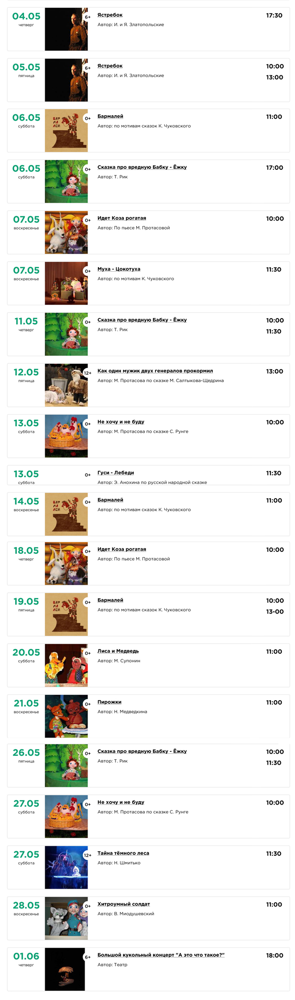 События во ВладимиреВладимирский областной театр куколАфиша на май 2017Опубликовано: 12 апреля 2017 ![]() ![]() Цена билетов: в выходные дни с 1 по 10 ряд - 190 руб. с 11 по 18 ряд - 170 руб. в будни - 150 руб. Информация с http://votk33.ru/events/?m=2017-05 |