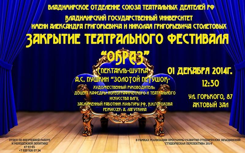 Программа фестиваля: 24 ноября 12.30 – открытие фестиваля. Театральная студия «Образ» Класс-концерт «Трудное – привычным, привычное – легким, лёгкое – прекрасным!!!» Художественный руководитель: народный артист России Н.А. Горохов продолжительность 1ч 25 ноября 12.30 – Театральная студия «Образ» Ф.М. Достоевский «Преступление и наказание» Режиссер: преподаватель кафедры хореографического и театрального искусства ВлГУ В. Кузнецов продолжительность 1ч 14.30 – Мастер класс Веры Ельниковой «Тренинг как настройка психофизического аппарата актера» продолжительность 1 ч 30 мин 26 ноября 12.30 – Театральный коллектив V курса ФФ ВлГУ «Остров невезения» по мотивам пьес А.Н Островского продолжительность 30 мин 13.30 – Театральный коллектив IV курса ФФ ВлГУ А.Н Островского «Гроза» продолжительность 30 мин 27 ноября 12.30 – Литературный клуб "Кто любил, уж тот любить не может..." по мотивам стихотворений С.А Есенина продолжительность 30 мин 13.30 – Театральный коллектив III курса ФФ ВлГУ А.Н Островского «Не все коту масленица» 28 ноября 12.30 – Театральная студия «Образ» «Ты жив, Пушкин!.. и поэты серебряного века» Художественный руководитель: доцент кафедры хореографического и театрального искусства ВлГУ, заслуженный работник культуры РФ, Н.И. Горохова Режиссер: А. Лагуткина продолжительность 1 ч 14.00 – Театральный коллектив II курса ФФ ВлГУ А.Н Островского «Женитьба Бальзаминова» продолжительность 30 мин. 14.30 – Мастер класс Светланы Рубан «Пластическая и контактная импровизация в театре» продолжительность 1 ч 30 мин 29 ноября 12.30 – народный музыкально-драматический театр «Поиск» г. Ковров А.П. Чехов «Предложение» водевиль Художественный руководитель: Т.В. Санникова продолжительность 1 ч 13.30 – Театральная студия «РИТМ» «Маскарад» по мотивам произведений М.Ю. Лермонтова Художественный руководитель: Л.В. Горшкова продолжительность 40 мин 1 декабря 12.30 – Закрытие фестиваля. Вручение наград. Театральная студия «Образ» А.С. Пушкин «Золотой петушок» спектакль-шутка Художественный руководитель: доцент кафедры хореографического и театрального искусства ВлГУ, заслуженный работник культуры РФ, Н.И. Горохова Режиссер: А. Лагуткина продолжительность 1 ч 20 мин![]()
