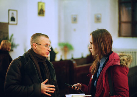 Довольны ли Вы сегодняшним выступлением? А.М. Безусловно, да. Нам было очень приятно сменить привычную обстановку – Центр классической музыки – на такое место. Тем более, до этого здесь выступал хор с малым составом оркестра, а сегодня впервые хор капеллы, и я доволен выступлением.