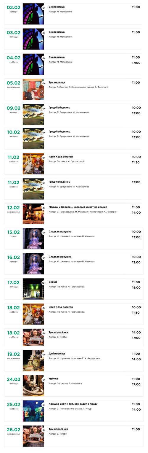 События во ВладимиреВладимирский областной театр куколАфиша на февраль 2017 г.Опубликовано: 17 января 2017 ![]() ![]() Касса работает с 09.00 до 18.00, тел.: +7 (4922) 32-36-88 Адрес: г. Владимир, ул. Гагарина, 7 Цена билетов: в выходные: дни с 1 по 10 ряд - 190 руб., с 11 по 18 ряд - 170 руб. в будни - 150 руб. Информация с http://votk33.ru/events/?m=2017-02 |