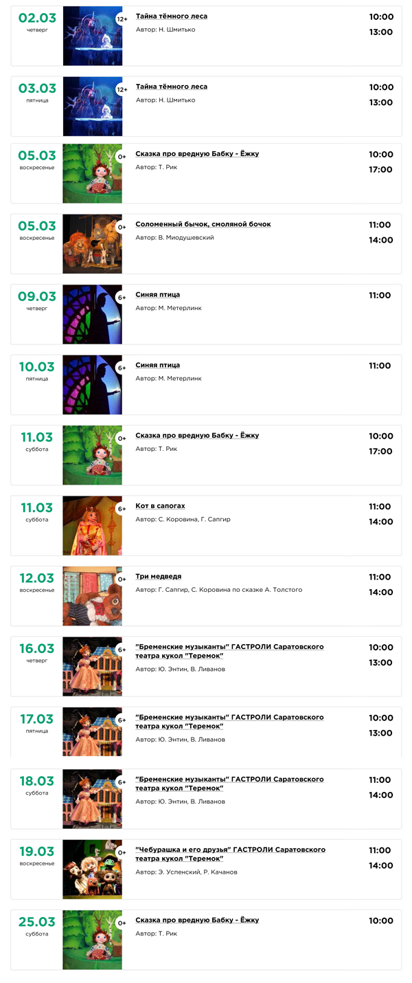 События во ВладимиреВладимирский областной театр куколАфиша на март 2017 г.Опубликовано: 07 февраля 2017 ![]() ![]() Цена билетов: в выходные дни с 1 по 10 ряд - 190 руб. с 11 по 18 ряд - 170 руб. в будни - 150 руб. Информация с http://votk33.ru/events/?m=2017-03 |