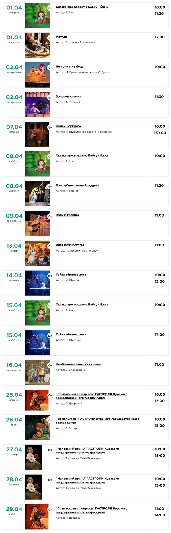 События во ВладимиреВладимирский областной театр куколАфиша на апрель 2017 г.Опубликовано: 15 марта 2017 ![]() ![]() Цена билетов: в выходные дни с 1 по 10 ряд - 190 руб. с 11 по 18 ряд - 170 руб. в будни - 150 руб. Цена билетов на спектакли Курского государственного театра кукол: в выходные дни - 200 руб. в будние дни - 160 руб. Информация с http://votk33.ru/events/?m=2017-03 |
