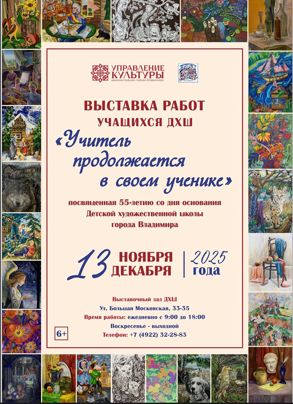 Выставки во ВладимиреВыставка работ учащихся «Учитель продолжается в своём ученике»13 ноября 2025 в 16:00 ![]() 13 ноября в 16.00 в выставочном зале Детской художественной школы города Владимира состоится открытие ретроспективной выставки работ учащихся «Учитель продолжается в своём ученике», в рамках празднования 55-летия со дня основания. Выставка - одно из многих праздничных мероприятий, которые школа проводит в этом учебном году. На выставке представлено более 100 ученических работ с 1970 по 2025 годы. Экспозиция составлена как своеобразный методический отчёт работы художественной школы за 55 лет. Помимо живописи, графики, станковой композиции, составляющих основу экспозиции, школа представляет скульптуру, и предметы декоративно-прикладного искусства: изделия из дерева, керамики и пр. В работах учащихся отражена наша повседневная жизнь: школа, многочисленные этюды и зарисовки с натуры, серьёзные учебные задания академического направления, но особое место занимает тема - любовь к родному городу. В экспозиции можно увидеть работы лучших воспитанников школы, награжденных в разное время премиями различных уровней. Выставка будет интересна как юным художникам, так и их родителям. Приглашаем всех жителей и гостей города Владимира посетить наш выставочный зал. Выставка работает до 13 декабря 2025 года по адресу: город Владимир, ул. Большая Московская, д. 33-35. Время работы с 9.00 до 18.00 Выходной день - воскресенье Информация с https://vk.com/wall-178663519_17793 Вход свободный. « вернуться владимирская афиша другие выставки во Владимире |