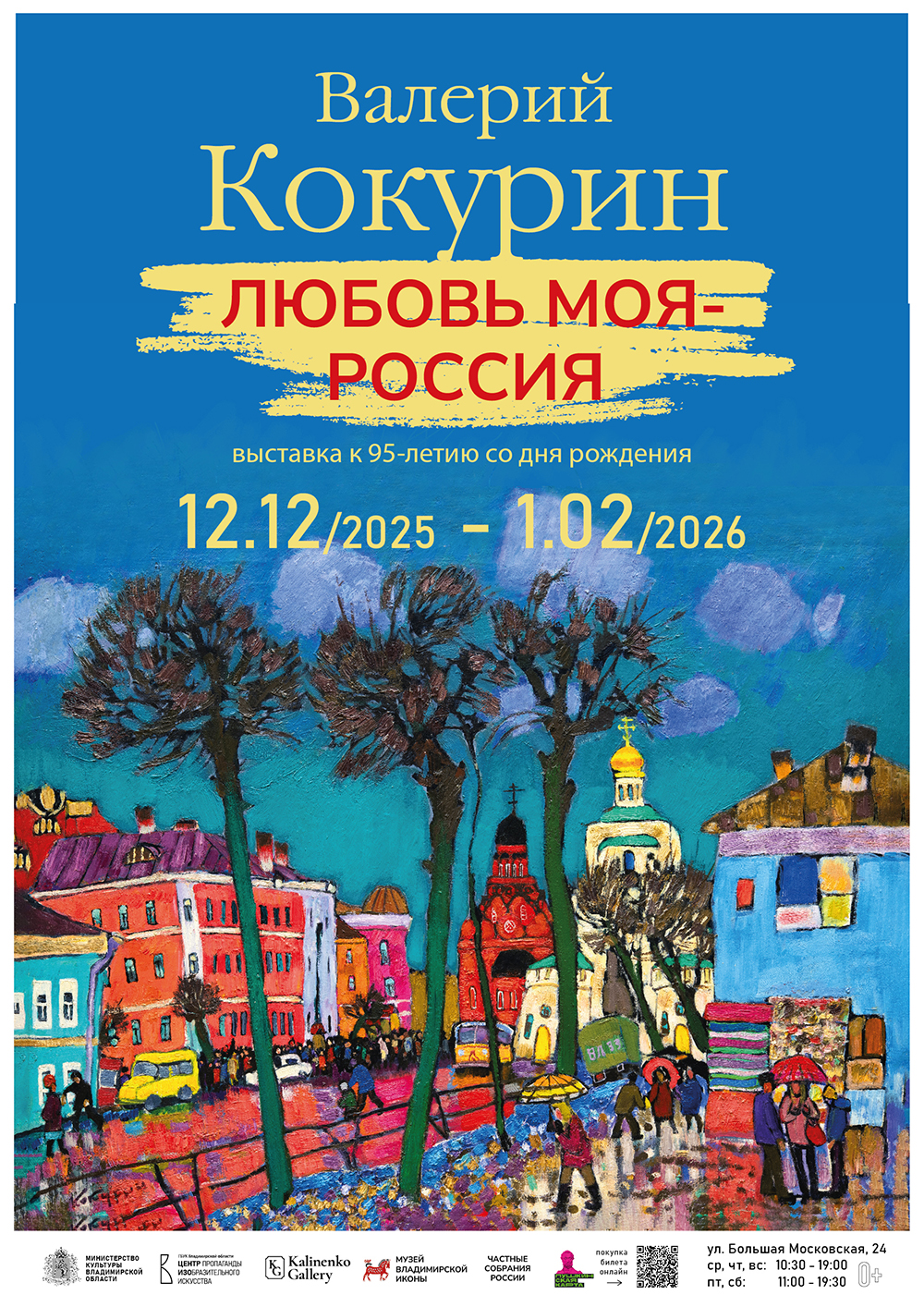 Выставки во ВладимиреВыставка «Любовь моя — Россия»12 декабря 2025 в 10:30 ![]() Центр пропаганды изобразительного искусства приглашает на выставку «Любовь моя – Россия», посвященную 95-летнему юбилею выдающегося российского художника, одного из мэтров владимирской живописной школы Валерия Григорьевича Кокурина. В экспозицию выставки вошли наиболее значимые произведения из семьи художника, частных собраний Москвы, Подмосковья, Петербурга, Владимира и др., созданные художником за долгий творческий путь, начиная с самых ранних работ и заканчивая полотнами последних лет. Валерий Кокурин – ярчайшая личность в искусстве владимирской земли, смелый художник-новатор, создавший собственную трактовку принципов владимирской живописной школы. Прежде всего, Валерий Кокурин пейзажист, именно пейзаж занимает в его творчестве центральное место. В сферу художественных интересов мастера входят так же портрет, натюрморт. Художник объездил всю страну, но лучшие его работы были написаны на родной земле. Валерий Кокурин любил город Владимир, считал его святым местом Руси. Художник умел увидеть родной город в неожиданном ракурсе, соединить на холстах старое и новое, прошлое и настоящее. Стихией Кокурина является цвет. В хороводе звонких красок проявляется темперамент художника, его неистребимое жизнелюбие. Художник видел жизнь, как дарованный свыше праздник. Наделенный от природы обостренным цветовым пониманием, даже среди смелых владимирских мастеров, он является самым ярким их представителем. Кокурин никогда не тиражировал свои произведения, не работал по шаблону. Каждая его картина индивидуальна, в каждой мы ощущаем присутствие его личности, слышим неповторимую авторскую интонацию. Лучшие произведения мастера хранятся в собраниях Государственной Третьяковской галереи, Государственного Русского музея, Государственного Владимиро-Суздальского музея-заповедника, Владимирского областного Центра пропаганды изобразительного искусства, почти в каждом художественном музее России, в частных отечественных и зарубежных собраниях. Для посетителей выставка откроется 12 декабря и продолжится до 1 февраля 2026 года в Центре пропаганды изобразительного искусства по адресу: г. Владимир, ул. Большая Московская, д. 24. Цена билета: 150-250 р. Приобретение билетов действует по Пушкинской карте. Добро пожаловать! Информация с https://www.izo33.ru/event/134743694 « вернуться владимирская афиша другие выставки во Владимире |