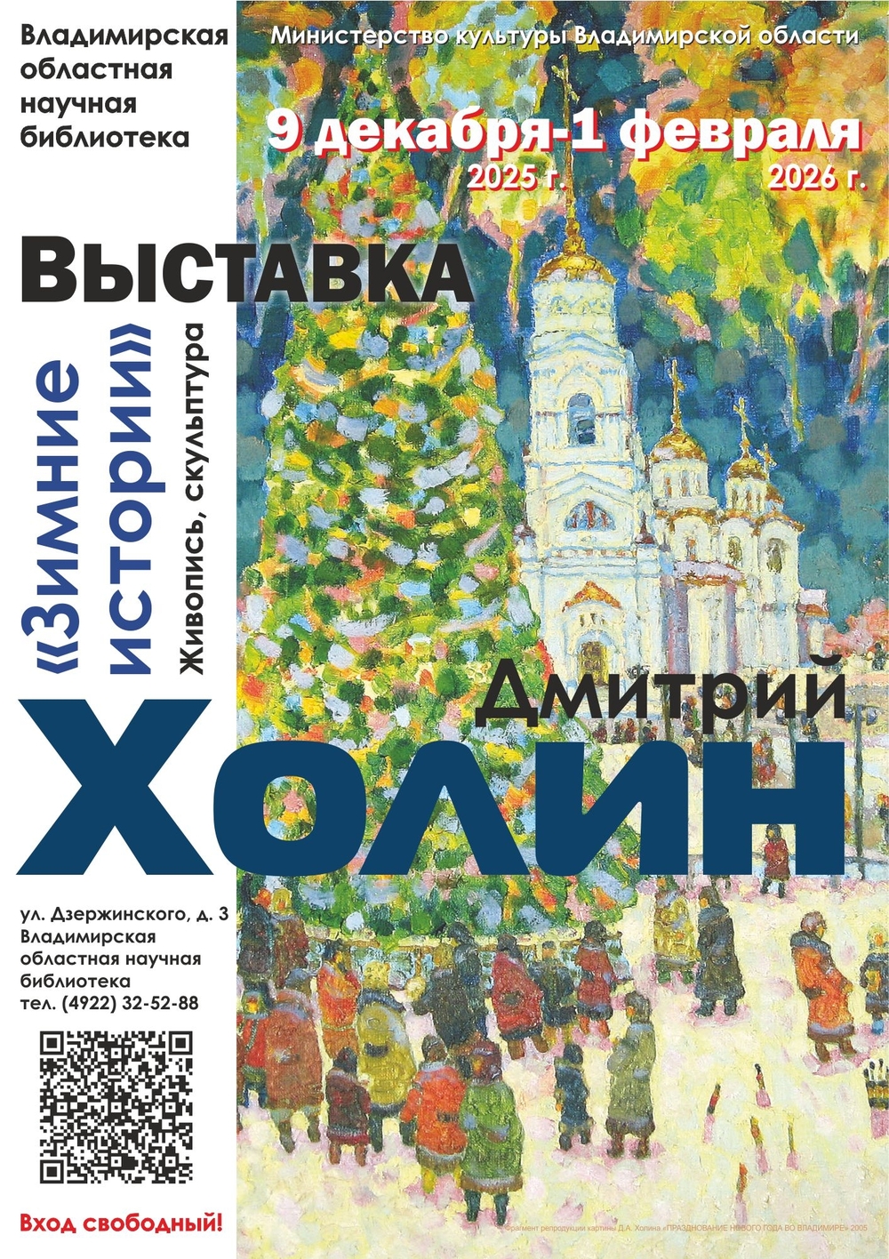 Выставки во ВладимиреВыставка живописи и скульптуры Д. Холина «Зимние истории»09 декабря 2025 в 10:00 ![]() С 9 декабря во Владимирской областной научной библиотеке сработает выставки живописи и скульптуры Дмитрия Холина «Зимние истории». На выставке будут представлены 27 картин станковой живописи, 22 этюда и 8 скульптур. Работы выполнены в разные годы, но объединены общей темой — это зимние пейзажи и сюжеты. Работы, действительно, очень богаты колористикой и узнаются, буквально, сразу. Особенно это относится к серии картин, основной темой которых стали народные праздники и гулянья. Это своеобразная визитная карточка Д. Холина. На пейзажных работах, представленных на выставке, изображены зимний Владимир, Александров, Гороховец, Суздаль, Мстера, Плёс — родные места, которые являются вдохновением для живописца. А этюды были сделаны им на пленэрах, которые проводились на родине заслуженного художника России, графика Б. Ф. Французова в Камешковском районе и на родине писателя В. А. Солоухина в с. Алепино Собинского района. Выставка «Зимние истории» Дмитрия Холина — это возможность познакомиться и с новым направлением в творчестве художника — скульптурой. Вырезанные из деревянных досок и расписанные масляными красками композиции являются своеобразным продолжением живописи художника. На выставке будут представлены скульптуры «Как тихо падал снег…» (2013), «Вечерние огоньки» (2013), «Зимнее» (2018) и др. Дмитрий Аркадьевич Холин — член Союза художников России, председатель регионального отделения СХ, Постоянный участник областных, региональных, зональных, российских и зарубежных выставок. Его работы находятся в фондах Владимиро-Суздальского музея-заповедника, Областного Центра пропаганды изобразительного искусства г. Владимира, в музеях Плёса, Ужгорода, Липецка, частных коллекциях в нашей стране и за рубежом. Выставка «Зимние истории» будет работать с 9 декабря 2025 г. по 1 февраля 2026 г. на галереях 2 этажа согласно графику работы библиотеки https://library.vladimir.ru/o-biblioteke/grafik-raboty.html. Вход свободный. Место проведения: Владимирская областная научная библиотека Адрес: г. Владимир, ул. Дзержинского, 3 Информация с https://library.vladimir.ru/rozhdestvenskie-nedeli-2025/vystavka-zhivopisi-i-skulptury-d-xolina-zimnie-istorii.html « вернуться владимирская афиша другие выставки во Владимире |